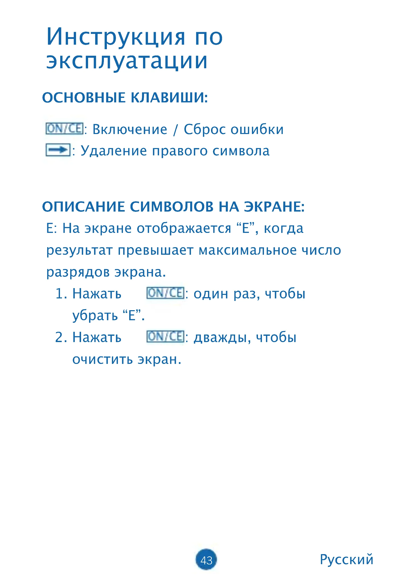 Инструкция по эксплуатации ОСНОВНЫЕ КЛАВИШИ: : Включение / Сброс ошибки : Удаление правого символа ОПИСАНИЕ СИМВОЛОВ НА ЭКРАНЕ: E: На экране отображается “E”, когда результат превышает максимальное число разрядов экрана.