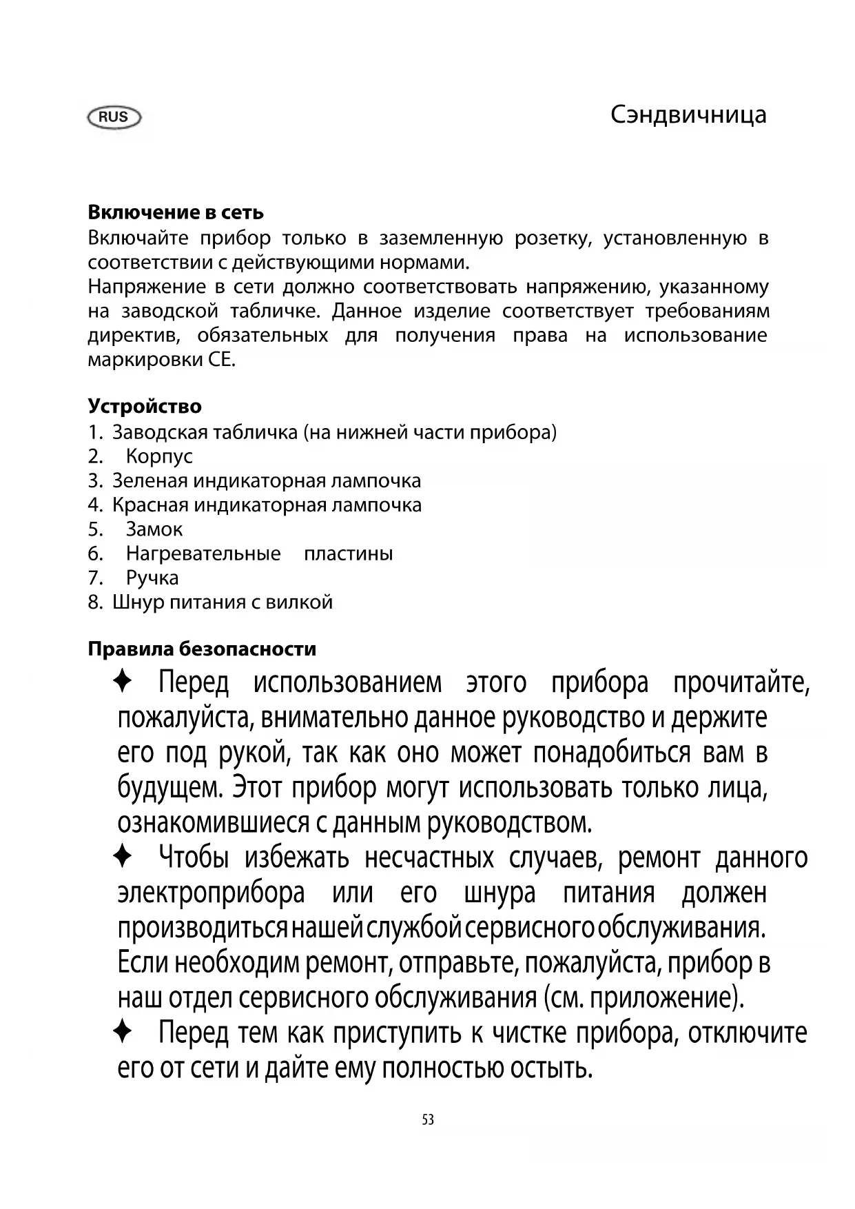 Предупреждение. Этот символ указывает на то, что доступная поверхность корпуса может сильно нагреваться во время эксплуатации. Не прикасайтесь ни к каким частям прибора, кроме ручки; если необходимо, используйте соответствующую кухонную прихватку. ✦ Этот прибор может использоваться детьми (не младше 8-летнего возраста) и лицами с ограниченными физическими, сенсорными или умственными способностями или не обладающими достаточным опытом и умением только при условии, что они находятся под присмотром или получили инструктаж по пользованию данным прибором, полностью осознают все опасности, которые могут при этом возникнуть, и ознакомлены с соответствующими правилами техники безопасности. ✦ Не разрешайте детям играть с прибором. ✦ Детям можно разрешать чистку и обслуживание прибора только под присмотром и если им не менее 8 лет. ✦ Никогда не допускайте к прибору и к его шнуру питания детей младше 8 лет.55 ✦ Предупреждение. Держите упаковочные материалы в недоступном для детей месте, так как они являются потенциальным источником опасности, например, удушья. ✦ Перед каждым включением электроприбора следует убедиться в отсутствии повреждений как на основном устройстве, включая и шнур питания, так и на любом дополнительном, если оно установлено. Если вы роняли прибор на твердую поверхность или прилагали чрезмерное усилие для вытягивания шнура питания, этот прибор не следует больше использовать: даже невидимое повреждение может отрицательно сказаться на эксплуатационной безопасности прибора. ✦ Не допускайте, чтобы прибор или шнур питания касались горячих поверхностей, таких как горячие конфорки электрической плиты или пламени газовой плиты. ✦ Всегда вынимайте вилку из розетки: - после использования; - при любой неполадке; - перед чисткой прибора. ✦ При извлечении вилки из стенной розетки никогда не тяните за шнур, беритесь только за вилку. ✦ Не допускайте свободного провисания шнура питания. ✦ Перед передвижением или для перемещения на хранение прибора, убедитесь, что он полностью остыл. ✦ Всегда ставьте электроприбор на теплостойкую и незагрязняющуюся поверхность, следя за тем, чтобы вокруг него было достаточно свободного пространства. ✦ Не оставляйте включенный прибор без присмотра, не ставьте его под занавесками, кухонными шкафами или в непосредственной близости от любых горючих материалов. ✦ Изготовитель не несет никакой ответственности за повреждение, вызванное неправильной эксплуатацией или нарушением настоящих указаний. ✦ Этот прибор предназначен для использования в домашних или подобных условиях, как, например: - в офисах или в других коммерческих помещениях; - в предприятиях, расположенных в сельской местности; - постояльцами в отелях, мотелях и т. д. и в других подобных заведениях; - в гостевых домах с предоставлением ночлега и завтрака.56 Первое включение ✦ Полностью освободите прибор от упаковочных материалов. ✦ Дайте прибору прогреться в течение примерно 10 минут с пластинами в сомкнутом положении. Так можно избавиться от типичного запаха, который обычно появляется при первом включении подобных приборов. При этом следует обеспечить достаточную вентиляцию. ✦ Затем почистите тостер, как указано в разделе «Общий уход и