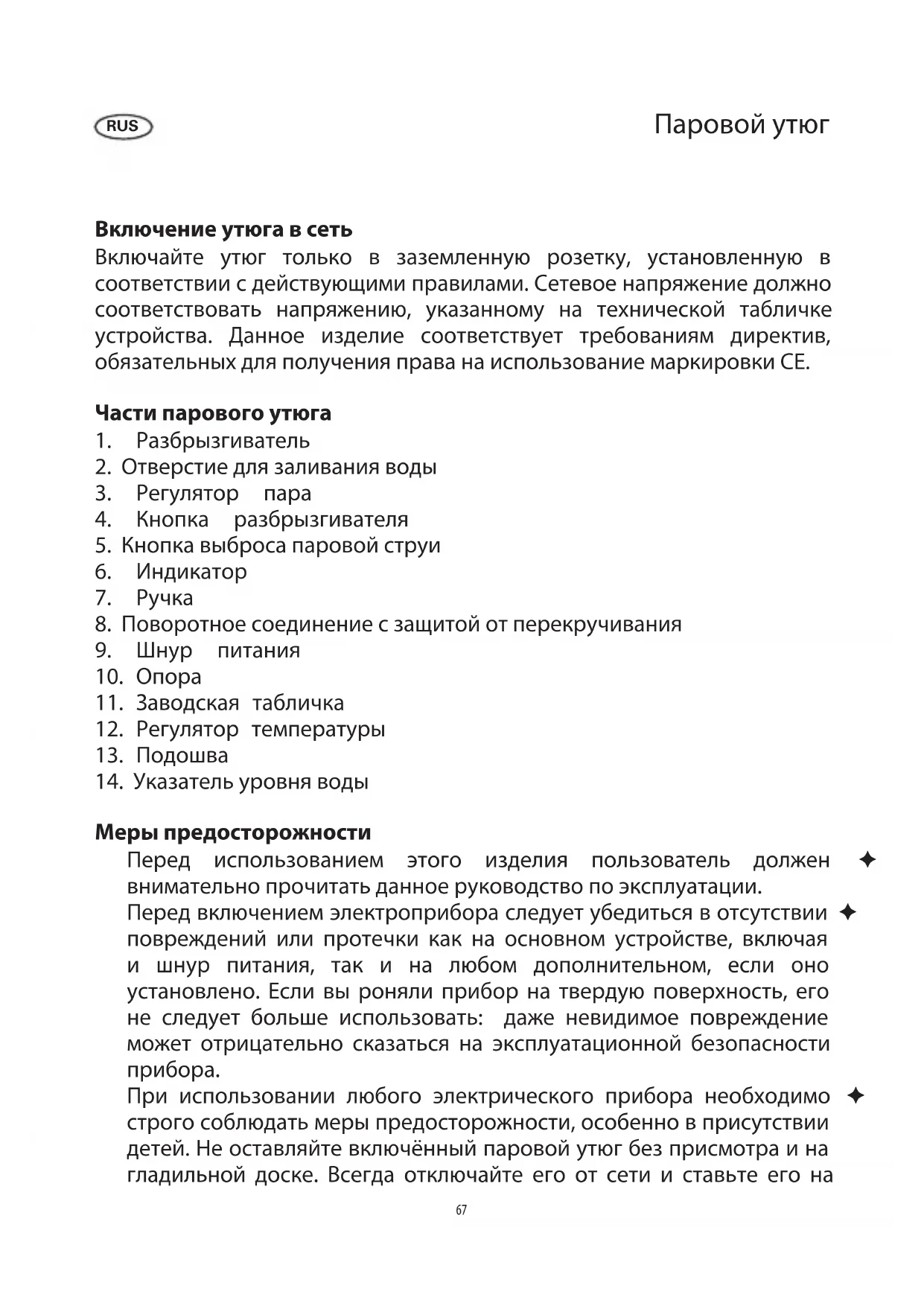 При использовании любого электрического прибора необходимо ✦ строго соблюдать меры предосторожности, особенно в присутствии детей. Не оставляйте включённый паровой утюг без присмотра и на гладильной доске. Всегда отключайте его от сети и ставьте его на RUS 67опору. При работе паровой утюг очень сильно нагревается. Вы можете ✦ получить серьёзный ожог, прикоснувшись к корпусу или к подошве утюга или при контакте с горячей водой или паром. При использовании парового утюга держите его только за ручку. Не допускайте никого близко к утюгу, когда используете функцию отпаривания. Следите за тем, чтобы шнур питания не соприкасался с горячими ✦ поверхностями. Не наматывайте шнур на горячий утюг. При работе прибор должен всегда находиться на ровной ✦ теплостойкой поверхности. Не ставьте прибор на горячие предметы или рядом с ними или с источниками открытого пламени, такими как нагревательные элементы электрической плиты или конфорки газовой плиты. Всегда вынимайте штепсельную вилку из розетки: ✦ после использования; ✦ при любой неполадке; ✦ перед чисткой прибора. ✦ При извлечении вилки из стенной розетки никогда не тяните за ✦ шнур, всегда только за вилку. Этот прибор не предназначен для использования без присмотра ✦ лицами (включая детей) с ограниченными физическими, сенсорными или умственными способностями, а также лицами, не обладающими достаточным опытом и умением, пока лицо, отвечающее за их безопасность, не обучит их обращению с данным прибором. Не оставляйте детей без присмотра, чтобы они не начали играть с ✦