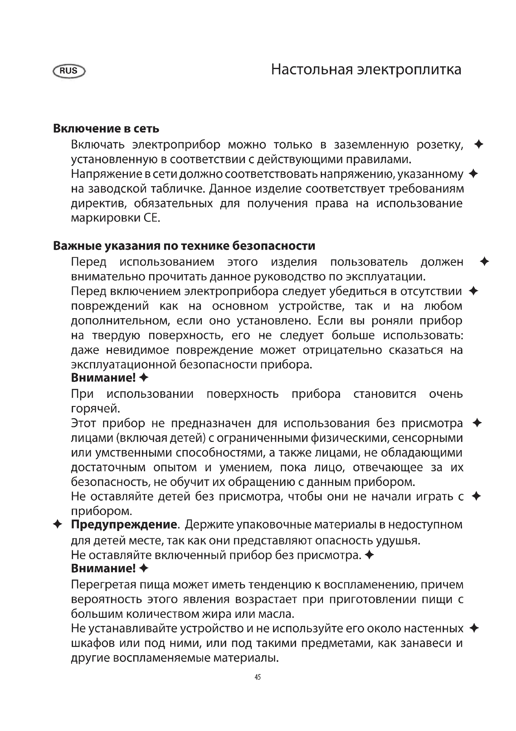 44Настольная электроплитка Включение в сеть Включать электроприбор можно только в заземленную розетку, ✦ установленную в соответствии с действующими правилами. Напряжение в сети должно соответствовать напряжению, указанному ✦ на заводской табличке. Данное изделие соответствует требованиям директив, обязательных для получения права на использование маркировки СЕ. Важные указания по технике безопасности Перед использованием этого изделия пользователь должен ✦ внимательно прочитать данное руководство по эксплуатации. Перед включением электроприбора следует убедиться в отсутствии ✦ повреждений как на основном устройстве, так и на любом дополнительном, если оно установлено. Если вы роняли прибор на твердую поверхность, его не следует больше использовать: даже невидимое повреждение может отрицательно сказаться на эксплуатационной безопасности прибора. Внимание! ✦ При использовании поверхность прибора становится очень