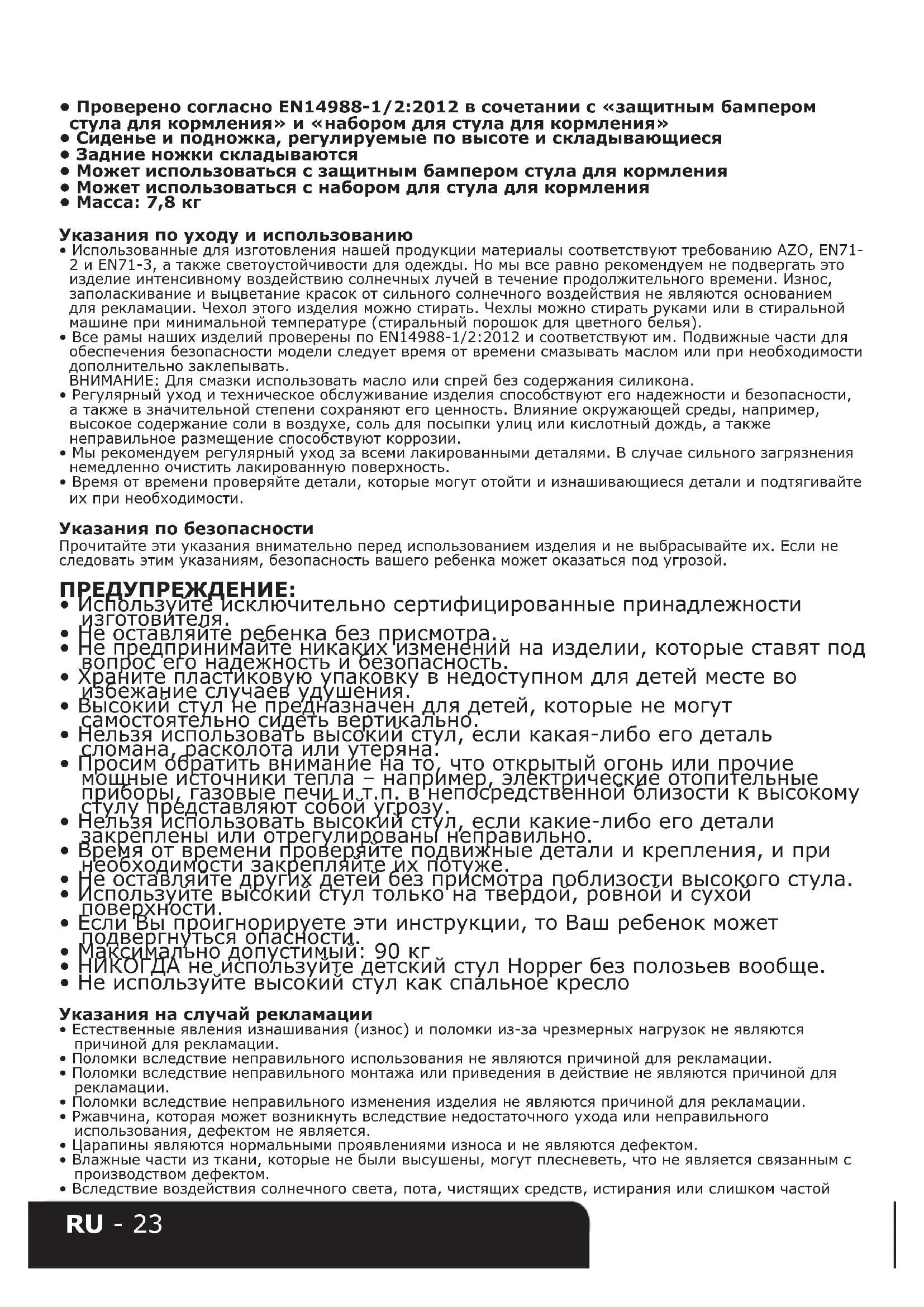 - Не используйте высокий стул как спальное кресло Указания на случай рекламации