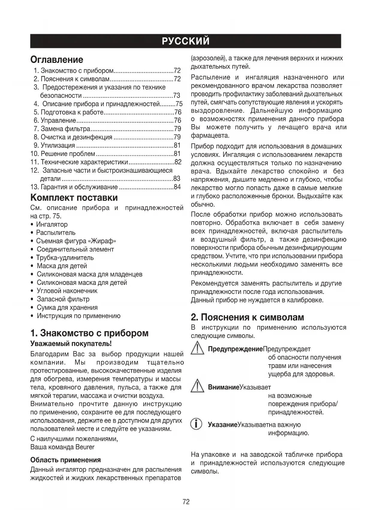 Уважаемый покупатель! Благодарим Вас за выбор продукции нашей компании. Мы производим тщательно протестированные, высококачественные изделия для обогрева, измерения температуры имассы тела, кровяного давления, пульса, атакже для мягкой терапии, массажа иочистки воздуха. Внимательно прочтите данную инструкцию поприменению, сохраните еедля последующего использования, держите еевдоступном для других пользователей месте иследуйте ееуказаниям. Снаилучшими пожеланиями, Ваша команда Beurer Область применения Данный ингалятор предназначен для распыления жидкостей ижидких лекарственных препаратов (аэрозолей), атакже для лечения верхних инижних дыхательных путей. Распыление и ингаляция назначенного или рекомендованного врачом лекарства позволяет проводить профилактику заболеваний дыхательных путей, смягчать сопутствующие явления иускорять выздоровление. Дальнейшую информацию о возможностях применения данного прибора Вы можете получить у лечащего врача или фармацевта. Прибор подходит для использования вдомашних условиях. Ингаляция сиспользованием лекарств должна осуществляться только поназначению врача. Вдыхайте лекарство спокойно и без напряжения, дышите медленно иглубоко, чтобы лекарство могло попасть даже всамые мелкие иглубоко расположенные бронхи. Выдыхайте как