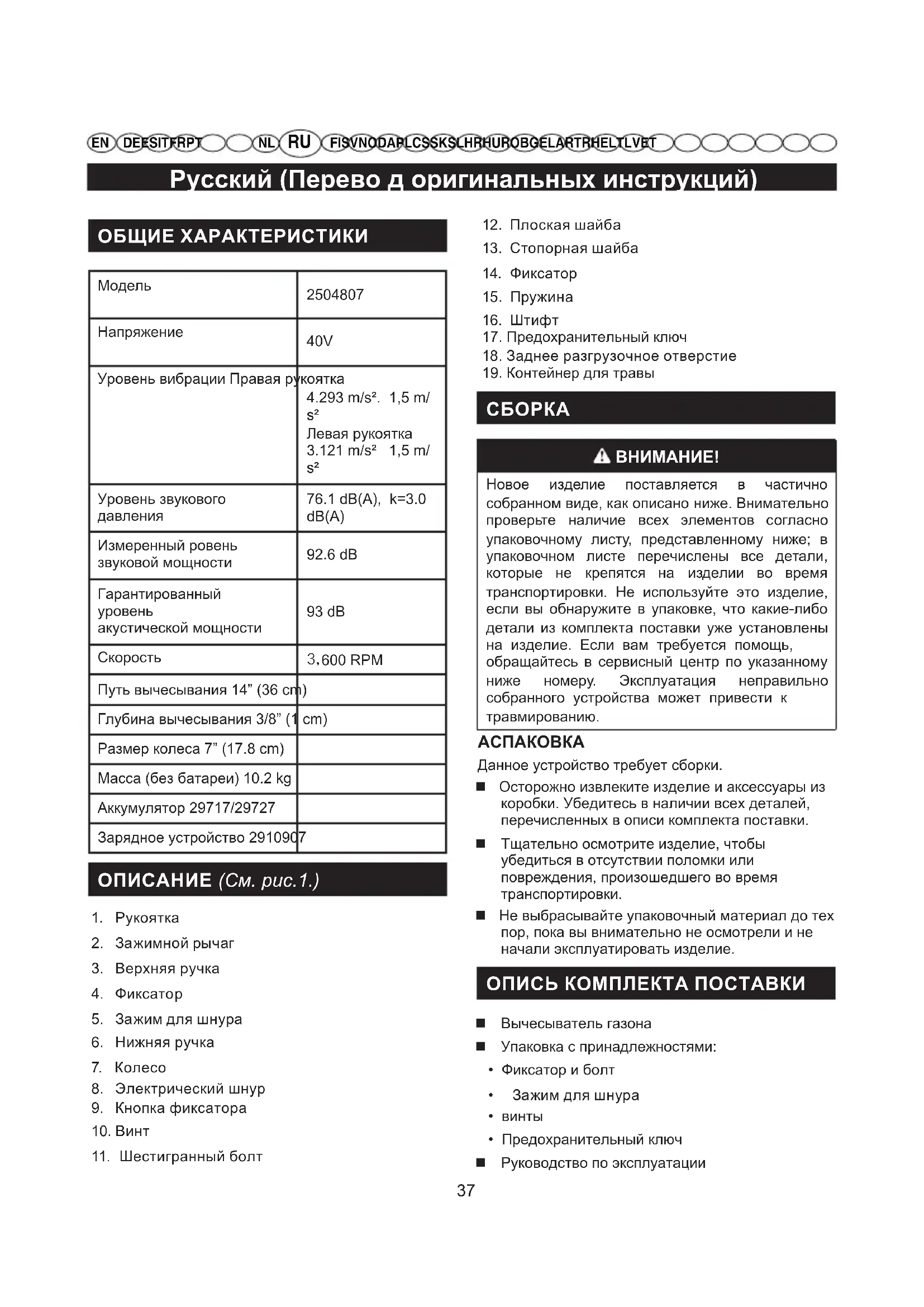 Для замены деталей аппарата используйте только идентичные запчасти. Использование любых других запчастей может создать опасность и привести к повреждению аппарата.Русский (Перево д оригинальных инструкций)