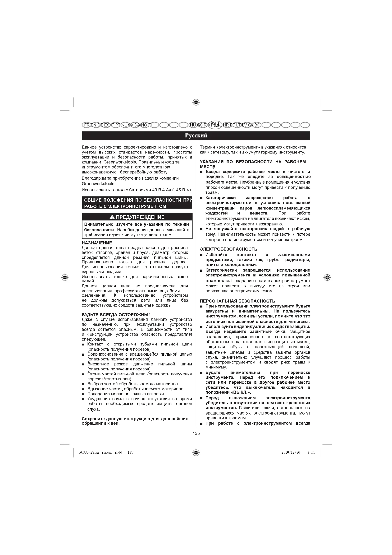 лючением электроинструмента убедитесь в отсутствии на нем всех крепежных инструментов. Гайки или ключи, оставленные на вращающихся частях электроинструмента, могут привести к травмам. ■ При работе с электроинструментом всегда RCS36-23lgs manual.indd 135 2010/12/30 3:14 Greenworkstools. Использовать только с батареями 40 В 4 Ач (146 Втч).136 êÛÒÒÍËÈ FR EN DE ES IT PT NL SV DA NO FI
