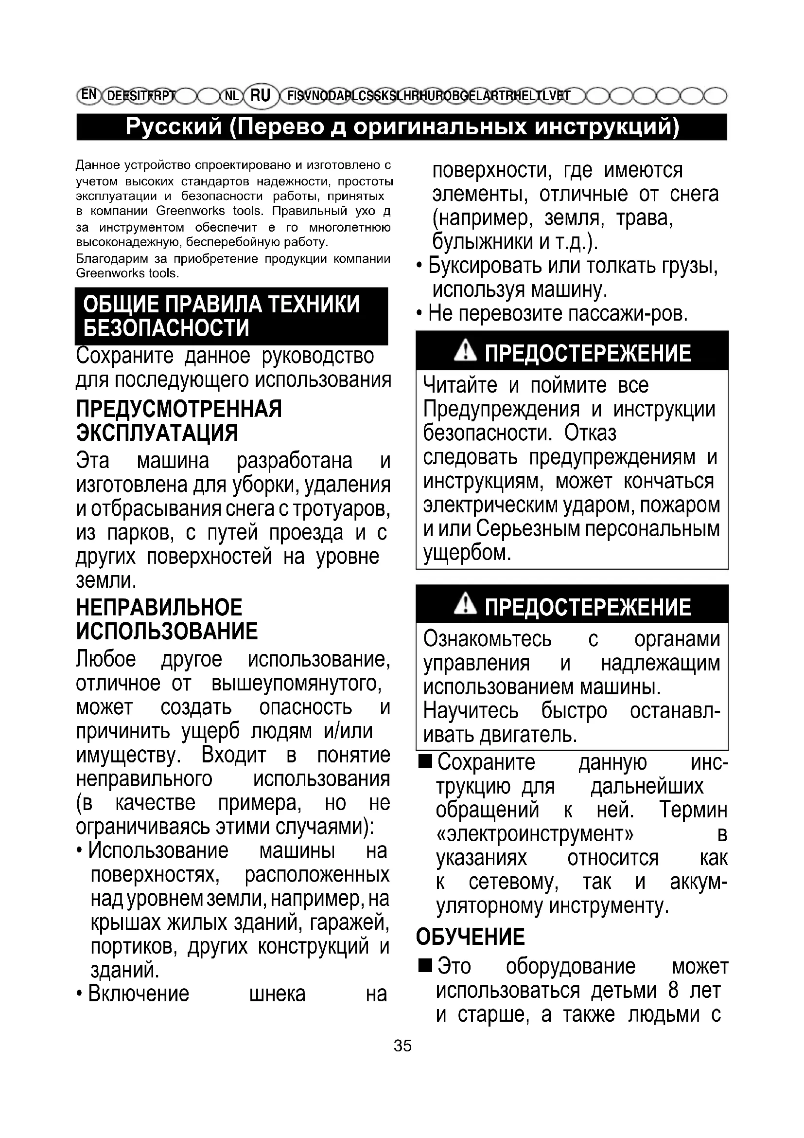 Это оборудование может использоваться детьми 8 лет и старше, а также людьми с Данное устройство спроектировано и изготовлено с учетом высоких стандартов надежности, простоты эксплуатации и безопасности работы, принятых в компании Greenworks tools. Правильный ухо д за инструментом обеспечит е го многолетнюю высоконадежную, бесперебойную работу. Благодарим за приобретение продукции компании Greenworks tools. ОБЩИЕ ПРАВИЛА ТЕХНИКИ БЕЗОПАСНОСТИ Сохраните данное руководство для последующего использования ПРЕДУСМОТРЕННАЯ ЭКСПЛУАТАЦИЯ Эта машина разработана и изготовлена для уборки, удаления и отбрасывания снега с тротуаров, из парков, с путей проезда и с других поверхностей на уровне
