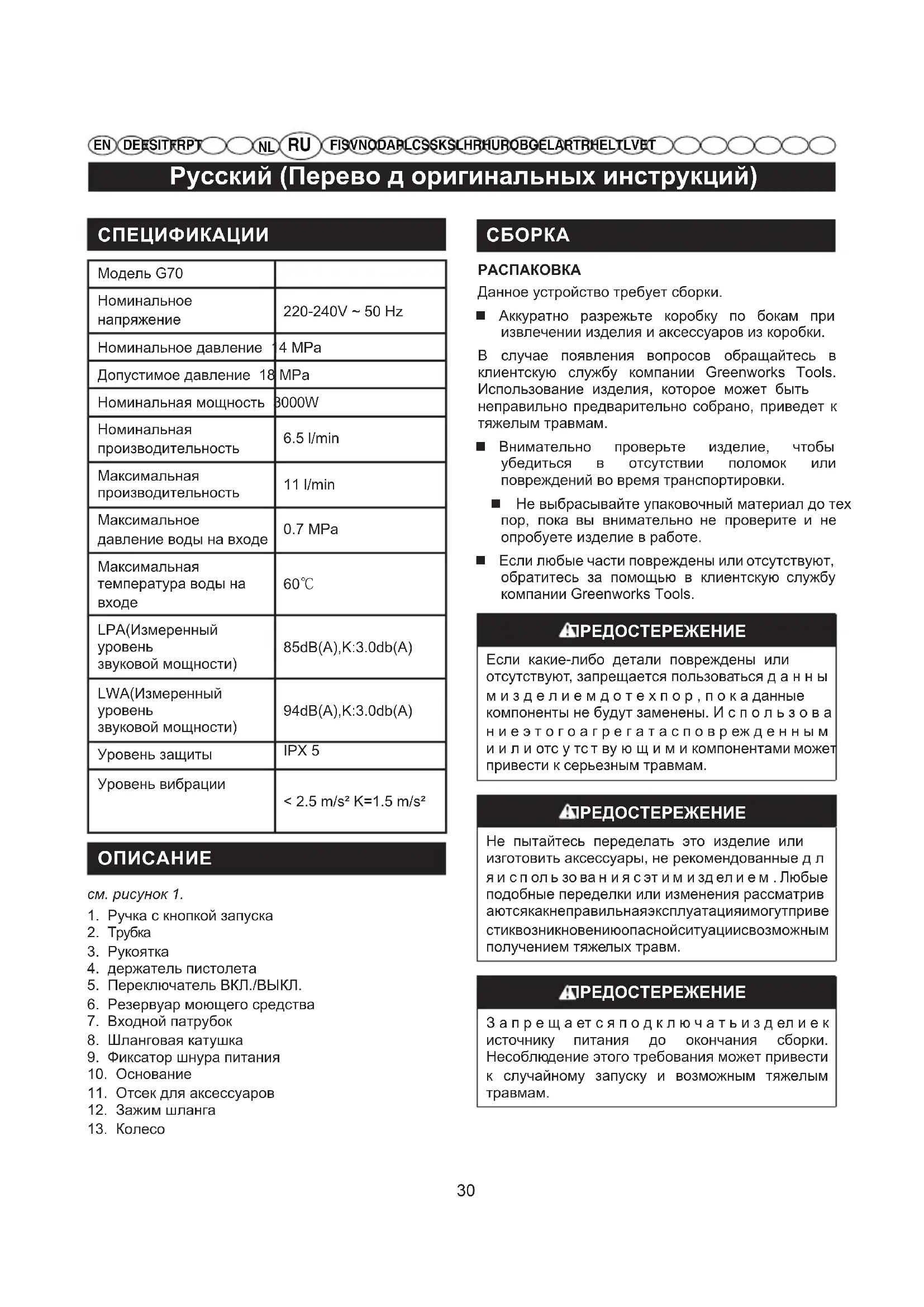 Данное устройство требует сборки. Аккуратно разрежьте коробку по бокам при извлечении изделия и аксессуаров из коробки. В случае появления вопросов обращайтесь в клиентскую службу компании Greenworks Tools. Использование изделия, которое может быть неправильно предварительно собрано, приведет к тяжелым травмам. Внимательно проверьте изделие, чтобы убедиться в отсутствии поломок или повреждений во время транспортировки. Не выбрасывайте упаковочный материал до тех пор, пока вы внимательно не проверите и не опробуете изделие в работе. Если любые части повреждены или отсутствуют, обратитесь за помощью в клиентскую службу компании Greenworks Tools. ПРЕДОСТЕРЕЖЕНИЕ Если какие-либо детали повреждены или отсутствуют, запрещается пользоваться д а н н ы м и з д е л и е м д о т е х п о р , п о к а данные компоненты не будут заменены. И с п о л ь з о в а н и е э т о г о а г р е г а т а с п о в р еж д е н н ы м и и л и отс у тс т ву ю щ и м и компонентами может привести к серьезным травмам. ПРЕДОСТЕРЕЖЕНИЕ Не пытайтесь переделать это изделие или изготовить аксессуары, не рекомендованные д л я и с п ол ь зо ва н и я с эт и м и зд ел и е м . Любые подобные переделки или изменения рассматрив аютсякакнеправильнаяэксплуатацияимогутприве стиквозникновениюопаснойситуациисвозможным получением тяжелых травм. ПРЕДОСТЕРЕЖЕНИЕ З а п р е щ а ет с я п о д к л ю ч а т ь и з д ел и е к источнику питания до окончания сборки. Несоблюдение этого требования может привести к случайному запуску и возможным тяжелым травмам.Русский (Перево д оригинальных инструкций)