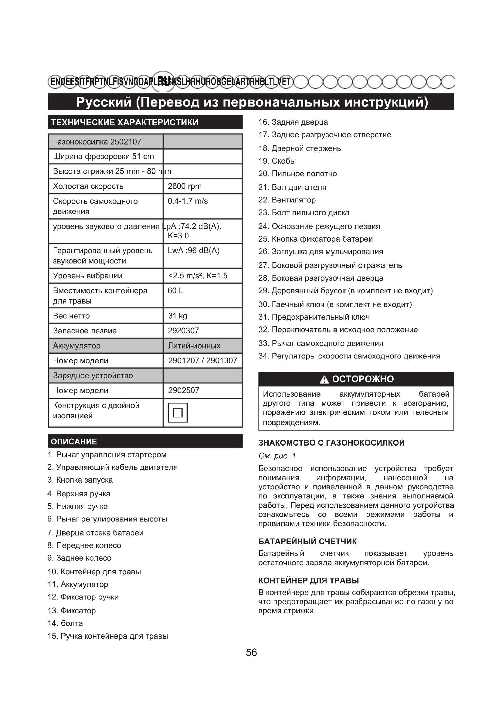 EN DE ES IT FR PT NL FI SV NO DA PL CS SK SL HR HU RO BG EL AR TR HE LT LV ET ТЕХНИЧЕСКИЕ ХАРАКТЕРИСТИКИГазонокосилка 2502107Ширина фрезеровки 51 cmВысота стрижки 25 mm - 80 mmХолостая скорость 2800 rpmСкорость cамоходногодвижения0.4-1.7 m/sуровень звукового давления LpA :74.2 dB(A), K=3.0Гарантированный уровень звуковой мощностиLwA :96 dB(A)Уровень вибрации <2.5 m/s², K=1.5Вместимость контейнера для травы 60 L Вес нетто 31 kgЗапасное лезвие 2920307Аккумулятор Литий-ионныхНомер модели 2901207 / 2901307Зарядное устройствоНомер модели 2902507Конструкция с двойнойизоляциейОПИСАНИЕ1. Рычаг управления стартером2. Управляющий кабель двигателя3. Кнопка запуска 4. Верхняя ручка5. Нижняя ручка6. Рычаг регулирования высоты7. Дверца отсека батареи8. Переднее колесо9. Заднее колесо10. Контейнер для травы11. Аккумулятор12. Фиксатор ручки13. Фиксатор болта15. Ручка контейнера для травы16. Задняя дверца17. Заднее разгрузочное отверстие18. Дверной стержень19. Скобы20. Пильное полотно21. Вал двигателя22. Вентилятор23. Болт пильного диска24. Основание режущего лезвия25. Кнопка фиксатора батареи26. Заглушка для мульчирования27. Боковой разгрузочный отражатель28. Боковая разгрузочная дверца29. Деревянный брусок (в комплект не входит)30. Гаечный ключ (в комплект не входит)31. Предохранительный ключ32. Переключатель в исходное положение33. Рычаг самоходного движения 34. Регуляторы скорости самоходного движения Использование аккумуляторных батарей другого типа может привести к возгоранию, поражению электрическим током или телесным повреждениям. ЗНАКОМСТВО С ГАЗОНОКОСИЛКОЙСм. рис. 1. Безопасное использование устройства требует понимания информации, нанесенной на устройство и приведенной в данном руководстве по эксплуатации, а также знания выполняемой работы. Перед использованием данного устройства ознакомьтесь со всеми режимами работы и правилами техники безопасности.БАТАРЕЙНЫЙ СЧЕТЧИК Батарейный счетчик показывает уровень остаточного заряда аккумуляторной батареи.КОНТЕЙНЕР ДЛЯ ТРАВЫВ контейнере для травы собираются обрезки травы, что предотвращает их разбрасывание по газону во время стрижки. 56Русский (Перевод из первоначальных инструкций)