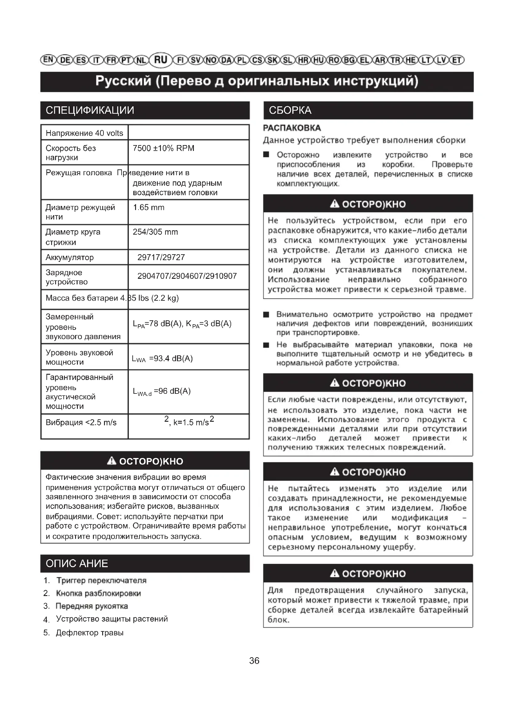 =93.4 dB(A)ПРИСОЕДИНЕНИЕ НАПРАВЛЯЮЩЕЙ Cм. Pис. 2. ■ Направляющая позволяет ограничить диапазон резки режущей струны и снизить риск повреждения режущей струной. ■ Чтобы использовать направляющую, нажмите на нее на головке триммера. СБОРКА ДЕФЛЕКТОРА ТРАВЫ Cм. Pис. 3. OCTOPO)KHO Avoid contact with the blade. Failure to avoid contact can result in serious personal injury. ■ Вынуть аккумулятор ■ Переверните триммер/кромкорез, чтобы получить доступ к головке триммера. ■ Вставьте щиток (1) в разъемы на головке триммера. ■ Совместите винтовые отверстия на защитном приспособлении с отверстиями для винтов на головке триммера. ■ Вставьте винт в головку триммера, чтобы закрепить защитное приспособление. OCTOPO)KHO Соблюдайте предельную осторожность, даже если вы хорошо знакомы с машиной. Не забывайте, что даже секундная рассеянность может привести к серьезным травмам. OCTOPO)KHO Всегда защищайте глаза. Несоблюдение этой нормы может привести к нанесению тяжелых повреждениий глаз, выбрасываемыми предметами. OCTOPO)KHO Не используйте компоненты или принадлежности, не рекомендованные изготовителем. Использование компонентов или принадлежностей, не рекомендованных изготовителем, может привести к тяжелым телесным повреждениям. УСТАНОВКА ВСПОМОГАТЕЛЬНОЙ РУКОЯТКИ