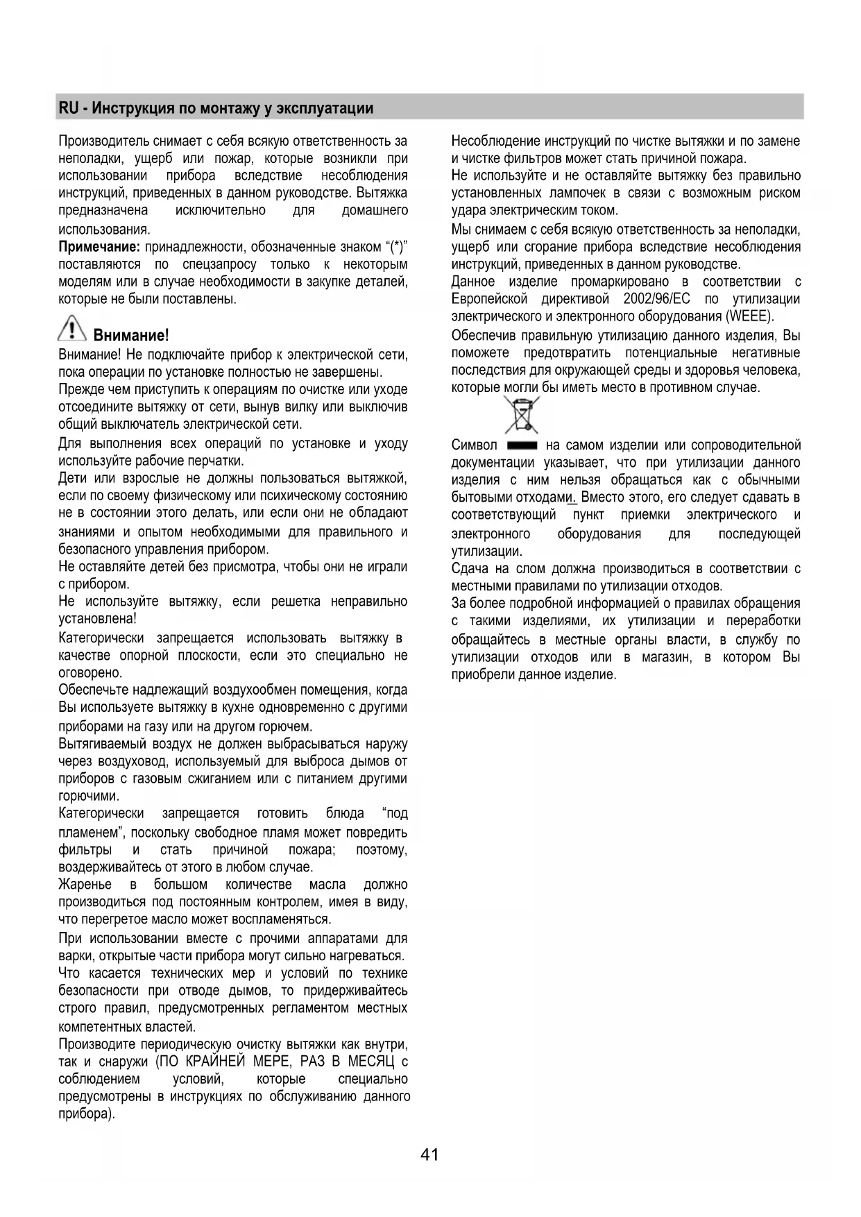 Несоблюдение инструкций по чистке вытяжки и по замене и чистке фильтров может стать причиной пожара. Не используйте и не оставляйте вытяжку без правильно установленных лампочек в связи с возможным риском удара электрическим током. Мы снимаем с себя всякую ответственность за неполадки, ущерб или сгорание прибора вследствие несоблюдения инструкций, приведенных в данном руководстве. Данное изделие промаркировано в соответствии с Европейской директивой 2002/96/EC по утилизации электрического и электронного оборудования (WEEE). Обеспечив правильную утилизацию данного изделия, Вы поможете предотвратить потенциальные негативные последствия для окружающей среды и здоровья человека, которые могли бы иметь место в противном случае.