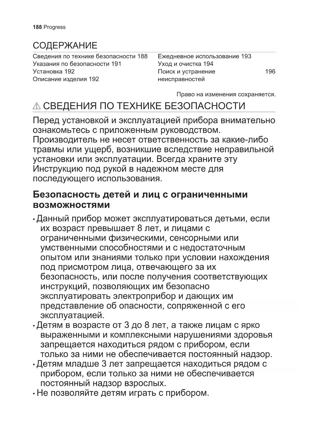 - Для очистки внутренней камеры прибора используйте тряпку или щетку. 190 ProgressУКАЗАНИЯ ПО БЕЗОПАСНОСТИ