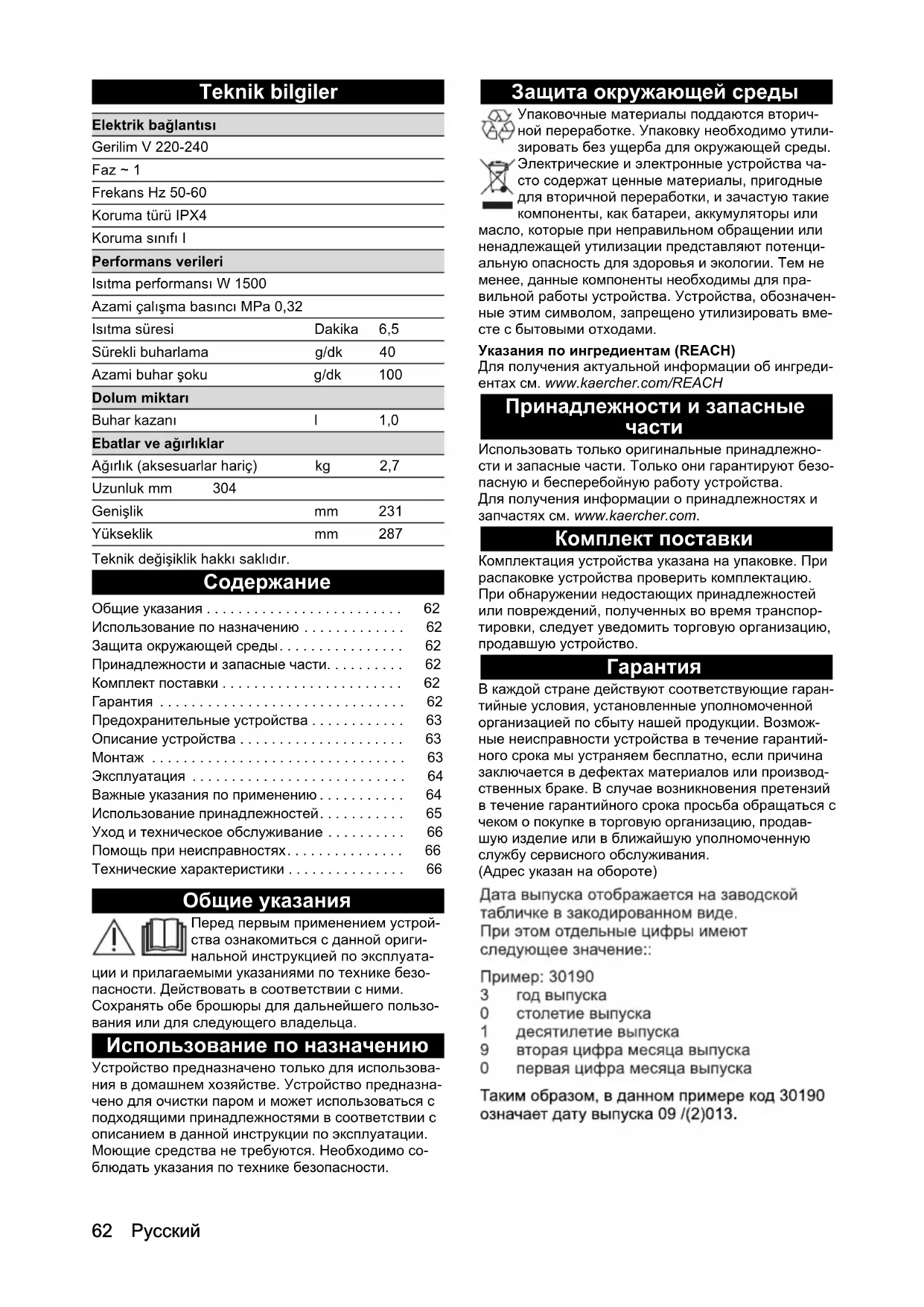 - В каждой стране действуют соответствующие гаран- тийные условия, установленные уполномоченной организацией по сбыту нашей продукции. Возмож- ные неисправности устройства в течение гарантий- ного срока мы устраняем бесплатно, если причина заключается в дефектах материалов или производ- ственных браке. В случае возникновения претензий в течение гарантийного срока просьба обращаться с чеком о покупке в торговую организацию, продав- шую изделие или в ближайшую уполномоченную службу сервисного обслуживания. (Адрес указан на обороте) Elektrik bağlantısı Gerilim V 220-240 Faz ~ 1 Frekans Hz 50-60 Koruma türü IPX4 Koruma sınıfı I Performans verileri Isıtma performansı W 1500 Azami çalışma basıncı MPa 0,32 Isıtma süresi Dakika 6,5 Sürekli buharlama g/dk 40 Azami buhar şoku g/dk 100 Dolum miktarı Buhar kazanı l 1,0 Ebatlar ve ağırlıklar Ağırlık (aksesuarlar hariç) kg 2,7 Uzunluk mm 304 Genişlik mm 231 Yükseklik mm 287 Общие указания p. 62