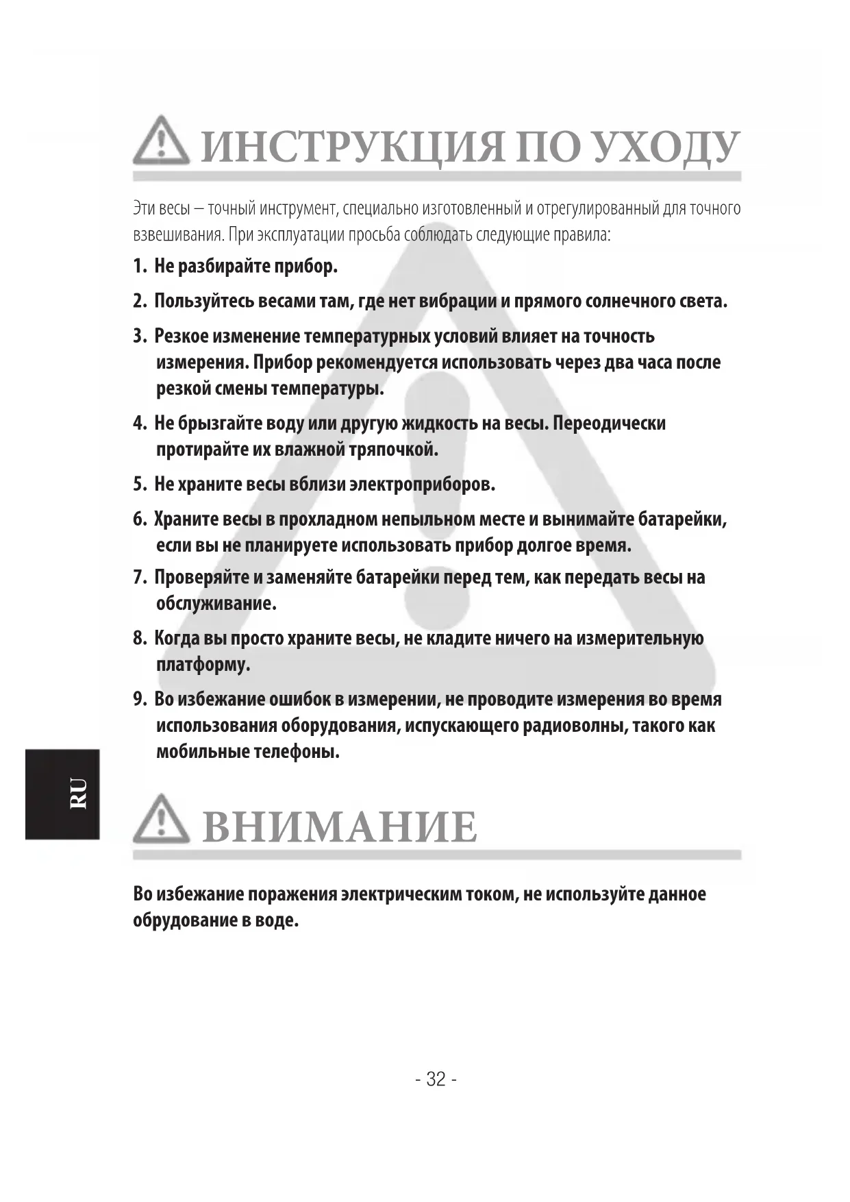 4. Не брызгайте воду или другую жидкость на весы. Переодически