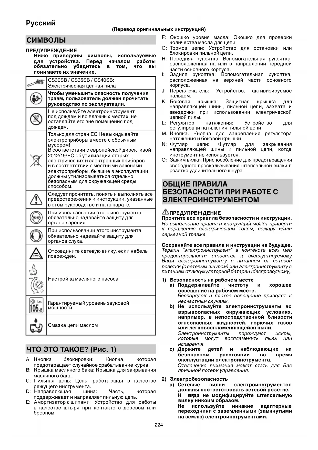 ПРЕДУПРЕЖДЕНИЕ Hижe пpивeдeны cимвoлы, иcпoльзyeмыe для устройства. Пepeд нaчaлoм paбoты oбязaтeльнo yбeдитecь в тoм, чтo вы пoнимaeтe иx знaчeниe. CS30SB / CS35SB / CS40SB: Электрическая цепная пила Чтобы уменьшить опасность получения травм, пользователь должен прочитать руководство по эксплуатации. Не используйте электроинструмент под дождем и во влажных местах, не оставляйте его вне помещения под
