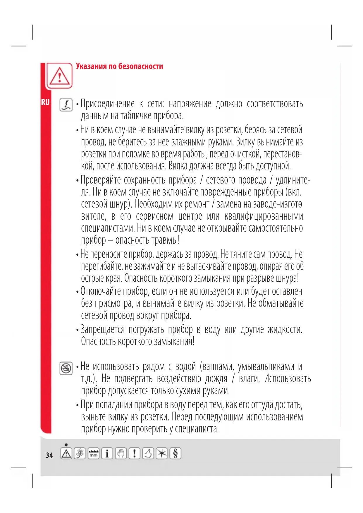 - Не использовать рядом с водой (ваннами, умывальниками и т.д.). Не подвергать воздействию дождя / влаги. Использовать прибор допускается только сухими руками!35 Указания по безопасности