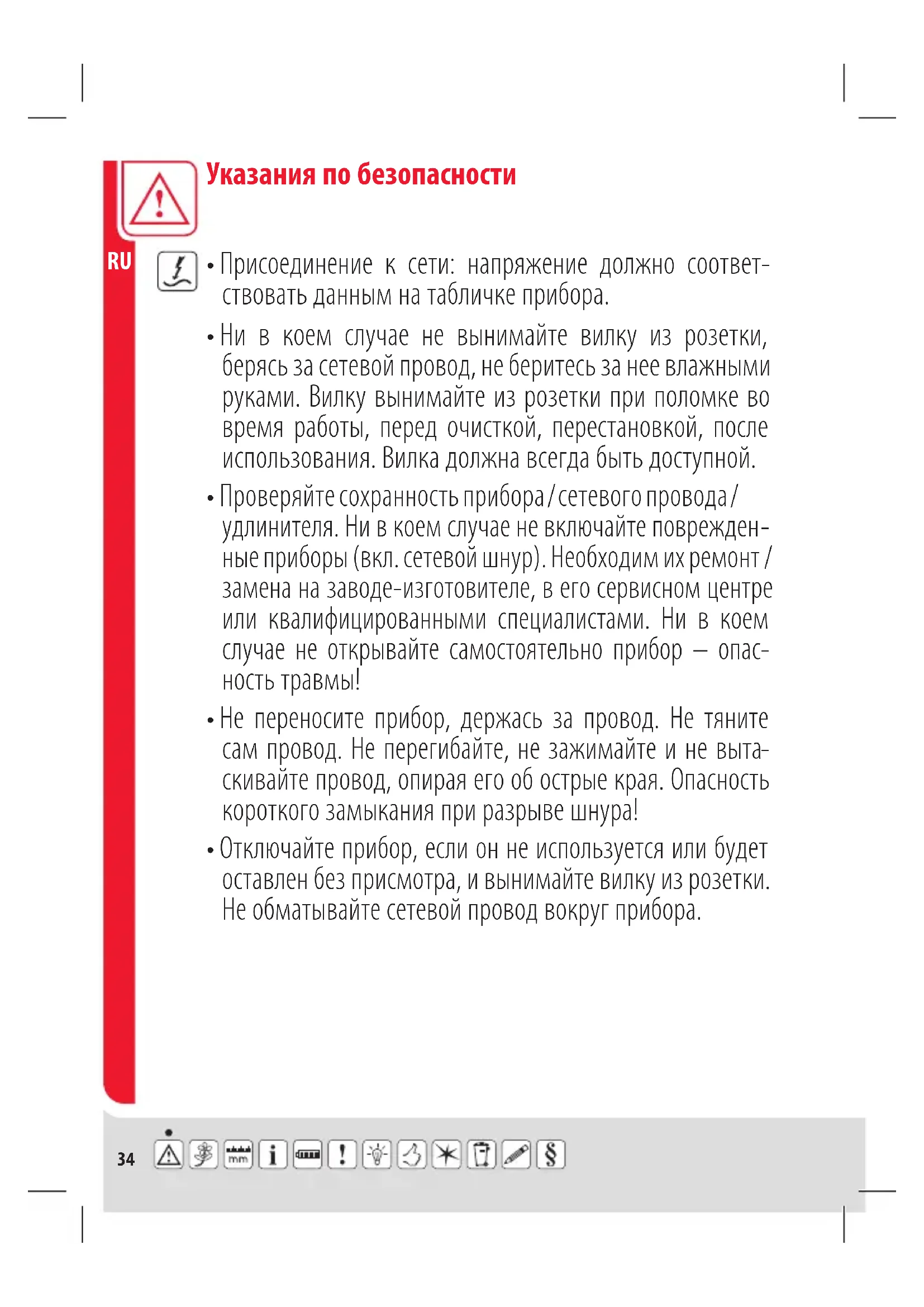 - Отключайте прибор, если он не используется или будет оставлен без присмотра, и вынимайте вилку из розетки. Не обматывайте сетевой провод вокруг прибора. Указания по безопасности35