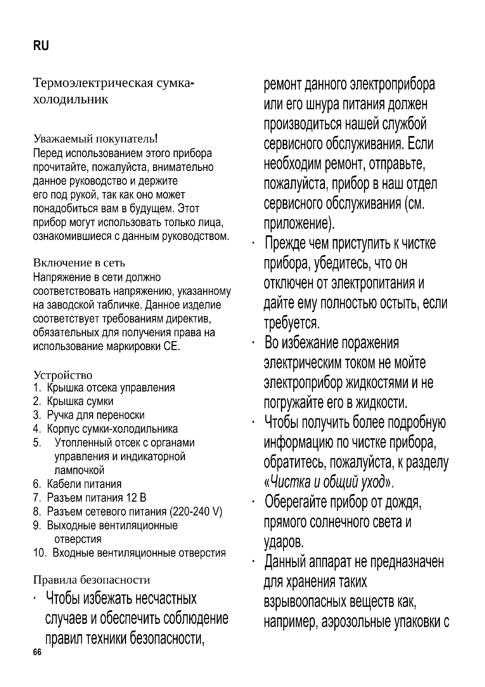 Χωρητικότητα ψύξης, κιλά/24ώρες -- Ταξινόμηση κλίματος SN, N Εύρος θερμοκρασίας περιβάλλοντος, °C 10-32 °C Εκπομπή θορύβου 35 dB(a) Διαστάσεις (Υ x Π x Β) σε mm 420 x 400 x 285 Βάρος, κιλά 4,0 Ηλεκτρικές προδιαγραφές Βλέπε πινακίδα ονομαστικών τιμών66 Термоэлектрическая сумка- холодильник Уважаемый покупатель! Перед использованием этого прибора прочитайте, пожалуйста, внимательно данное руководство и держите его под рукой, так как оно может понадобиться вам в будущем. Этот прибор могут использовать только лица, ознакомившиеся с данным руководством. Включение в сеть Напряжение в сети должно соответствовать напряжению, указанному на заводской табличке. Данное изделие соответствует требованиям