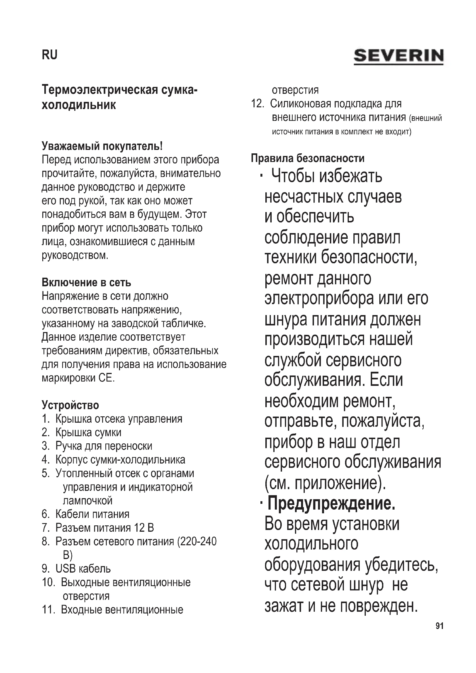 внешнего источника питания (внешний источник питания в комплект не входит) Правила безопасности ∙ Чтобы избежать несчастных случаев и обеспечить соблюдение правил техники безопасности, ремонт данного электроприбора или его шнура питания должен производиться нашей службой сервисного обслуживания. Если необходим ремонт, отправьте, пожалуйста, прибор в наш отдел сервисного обслуживания (см. приложение). ∙ Предупреждение. Во время установки холодильного оборудования убедитесь, что сетевой шнур не зажат и не поврежден. RU92 104 x 142 mm ∙ Прежде чем приступить к чистке прибора, убедитесь, что он отключен от электропитания и дайте ему полностью остыть, если требуется. ∙ Во избежание поражения электрическим током не мойте электроприбор жидкостями и не погружайте его в
