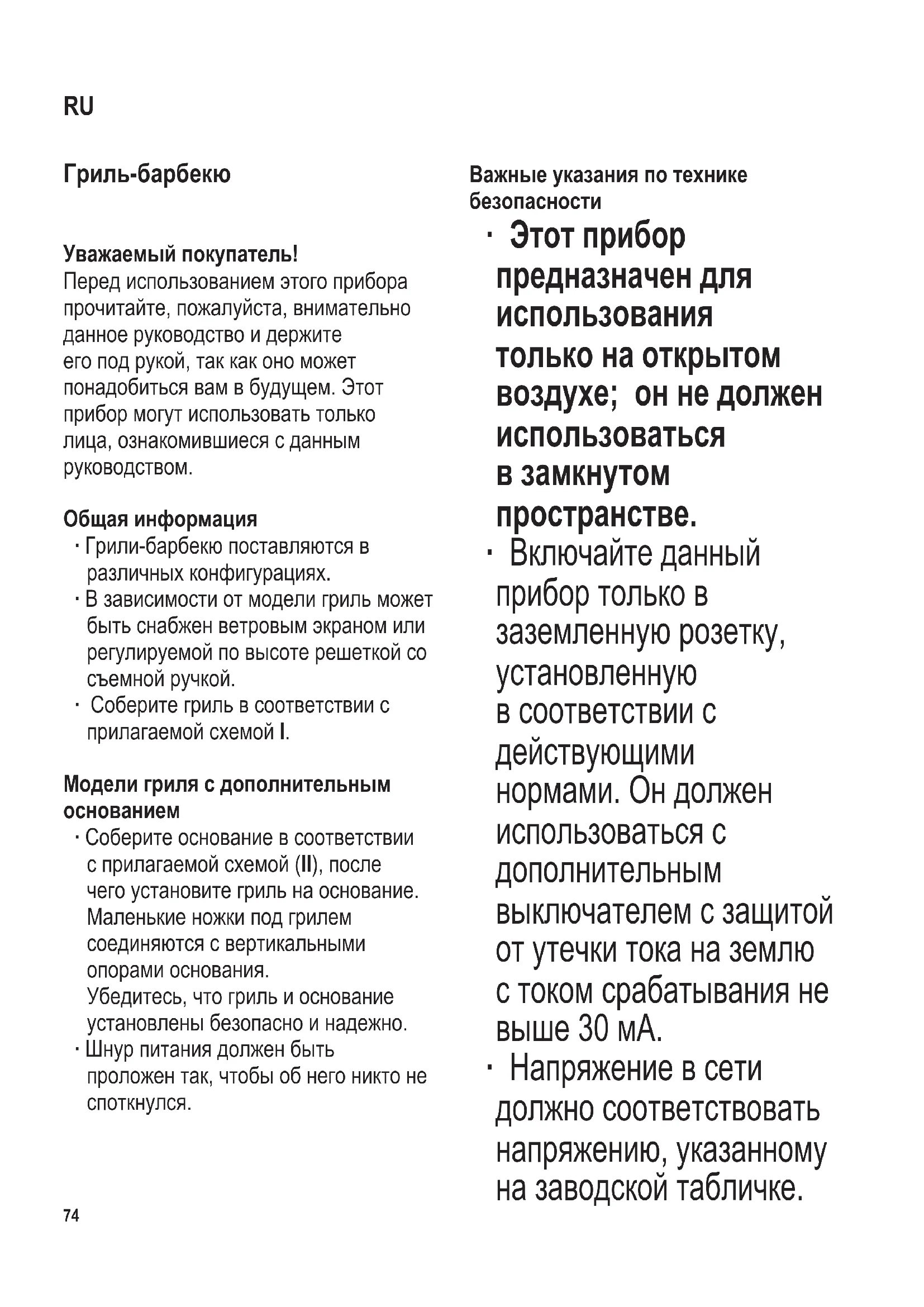 ∙ Соберите основание в соответствии с прилагаемой схемой (II), после чего установите гриль на основание. Маленькие ножки под грилем соединяются с вертикальными опорами основания. Убедитесь, что гриль и основание установлены безопасно и надежно. ∙ Шнур питания должен быть проложен так, чтобы об него никто не споткнулся. Важные указания по технике безопасности ∙ Этот прибор предназначен для использования только на открытом воздухе; он не должен использоваться в замкнутом пространстве. ∙ Включайте данный прибор только в заземленную розетку, установленную в соответствии с действующими нормами. Он должен использоваться с дополнительным выключателем с защитой от утечки тока на землю с током срабатывания не выше 30 мА. ∙ Напряжение в сети должно соответствовать напряжению, указанному на заводской табличке. RU104 x 142 mm