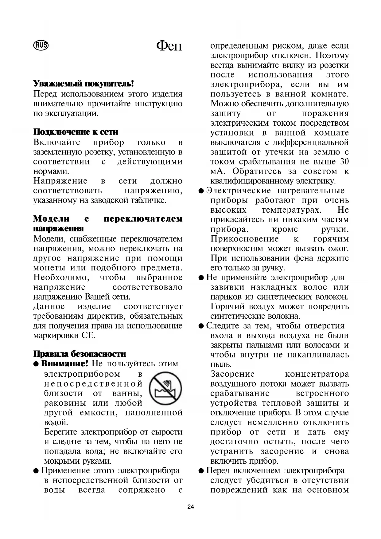 ● ! Не пользуйтесь этим электроприбором в непосредственной близости от ванны, раковины или любой другой емкости, наполненной