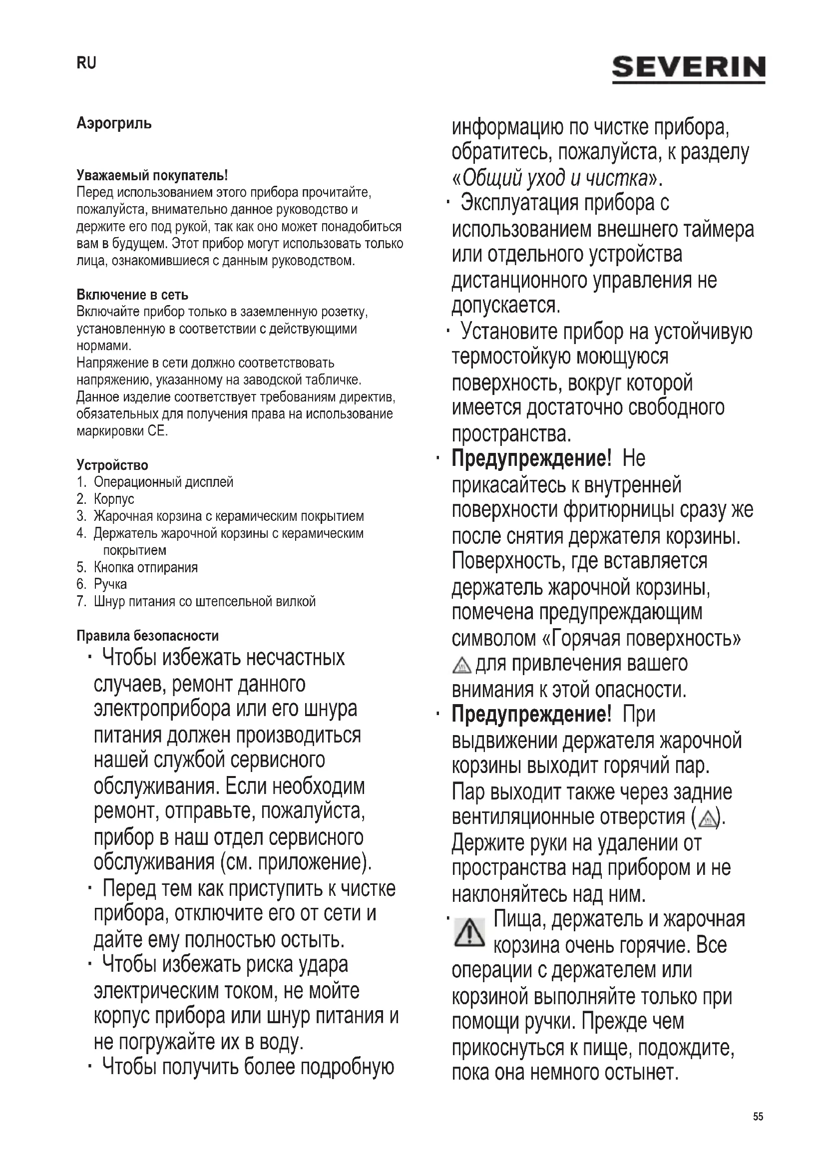 Пища, держатель и жарочная корзина очень горячие. Все операции с держателем или корзиной выполняйте только при помощи ручки. Прежде чем прикоснуться к пище, подождите, пока она немного остынет. RU56 142 x 208 mm ∙ Всегда ставьте держатель корзины только на термостойкую поверхность. ∙ Этот электроприбор предназначен для использования в домашних или подобных условиях, как, например: - в кухнях для персонала, расположенных в офисах или в других коммерческих помещениях; - в предприятиях, расположенных в сельской местности; - постояльцами в отелях, мотелях и в других подобных местах проживания; - в гостевых домах с предоставлением ночлега и
