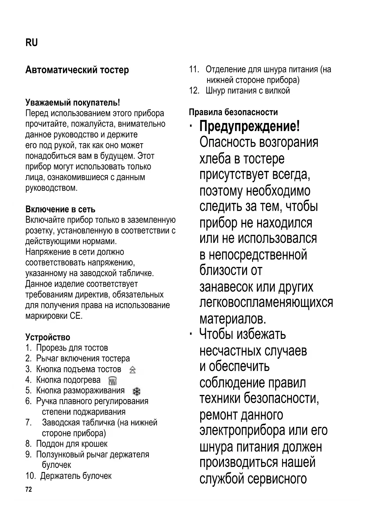 Правила безопасности ∙ Предупреждение! Опасность возгорания хлеба в тостере присутствует всегда, поэтому необходимо следить за тем, чтобы прибор не находился или не использовался в непосредственной близости от занавесок или других легковоспламеняющихся материалов. ∙ Чтобы избежать несчастных случаев и обеспечить соблюдение правил техники безопасности, ремонт данного электроприбора или его шнура питания должен производиться