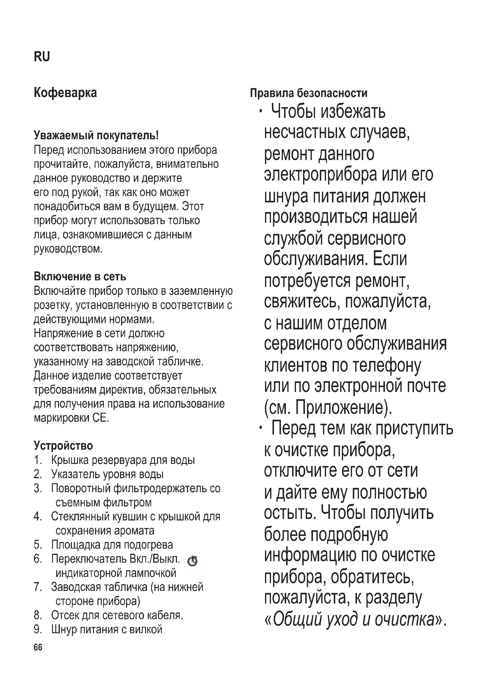 Правила безопасности ∙ Чтобыизбежать несчастныхслучаев, ремонтданного электроприбораилиего шнурапитаниядолжен производитьсянашей службойсервисного обслуживания.Если потребуетсяремонт, свяжитесь,пожалуйста, снашимотделом сервисногообслуживания клиентовпотелефону илипоэлектроннойпочте (см.Приложение). ∙ Передтемкакприступить кочисткеприбора, отключитеегоотсети идайтеемуполностью остыть.Чтобыполучить болееподробную информациюпоочистке прибора,обратитесь, пожалуйста,кразделу «Общий уход и очистка». RU104 x 142 mm