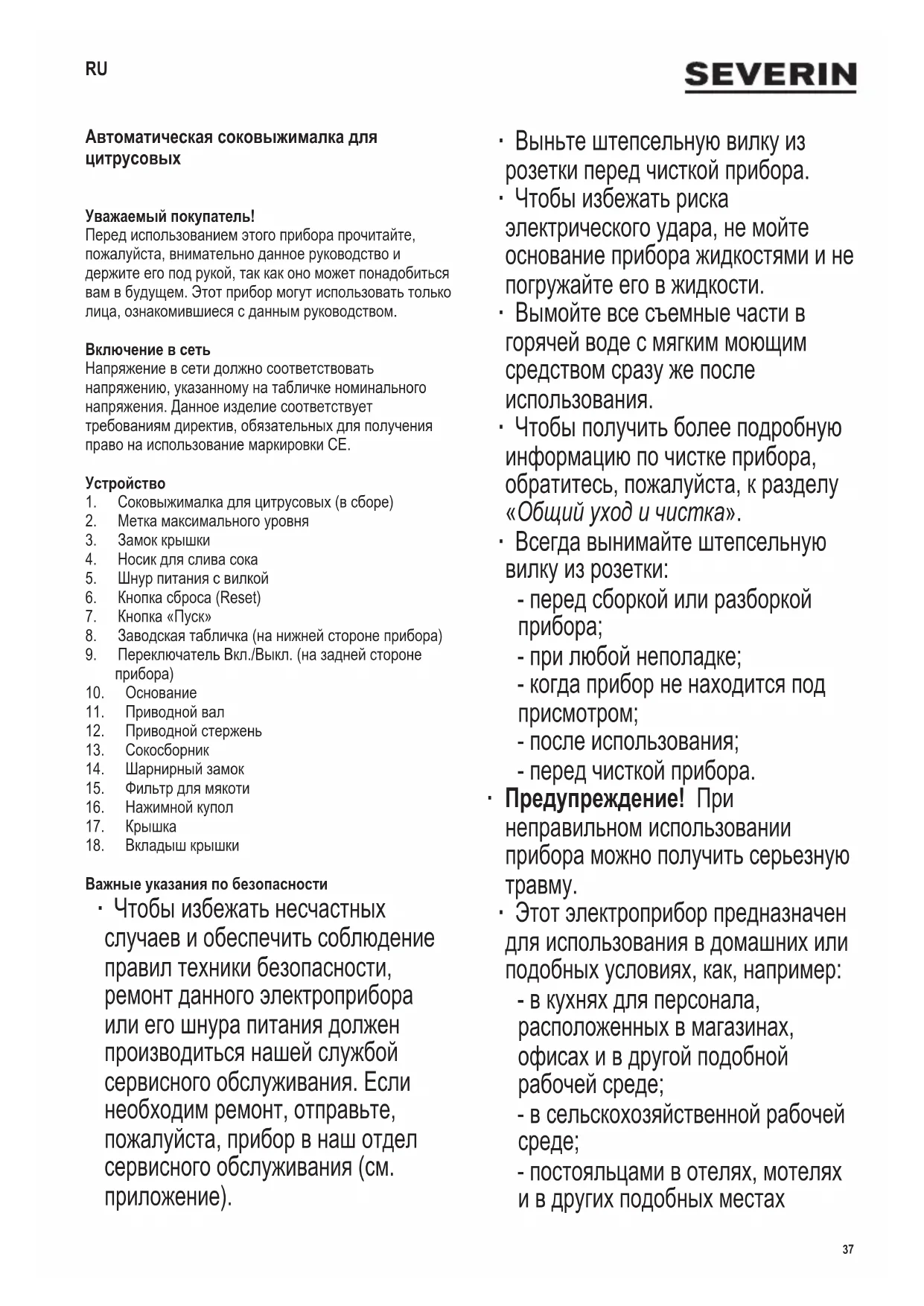 РУКОВОДСТВО ПОЛЬЗОВАТЕЛЯ CP 3537 SEVERIN