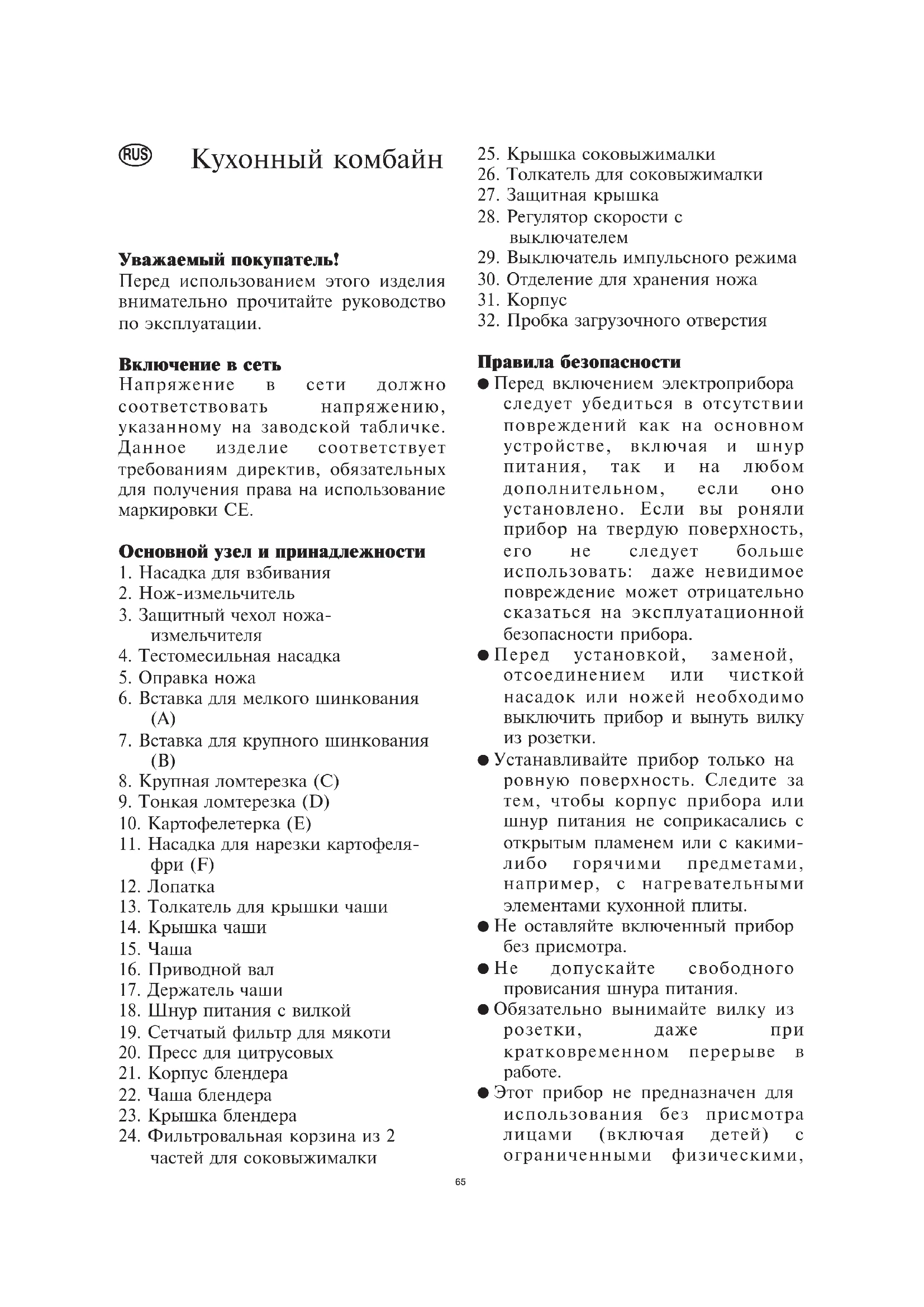 ● Перед включением электроприбора следует убедиться в отсутствии повреждений как на основном устройстве, включая и шнур питания, так и на любом дополнительном, если оно установлено. Если вы роняли прибор на твердую поверхность, его не следует больше использовать: даже невидимое повреждение может отрицательно сказаться на эксплуатационной безопасности прибора. ● Перед установкой, заменой, отсоединением или чисткой насадок или ножей необходимо выключить прибор и вынуть вилку из розетки. ● Устанавливайте прибор только на ровную поверхность. Следите за тем, чтобы корпус прибора или шнур питания не соприкасались с открытым пламенем или с какими- либо горячими предметами, например, с нагревательными элементами кухонной плиты. ● Не оставляйте включенный прибор без присмотра. ● Не допускайте свободного провисания шнура питания. ● Обязательно вынимайте вилку из розетки, даже при кратковременном перерыве в