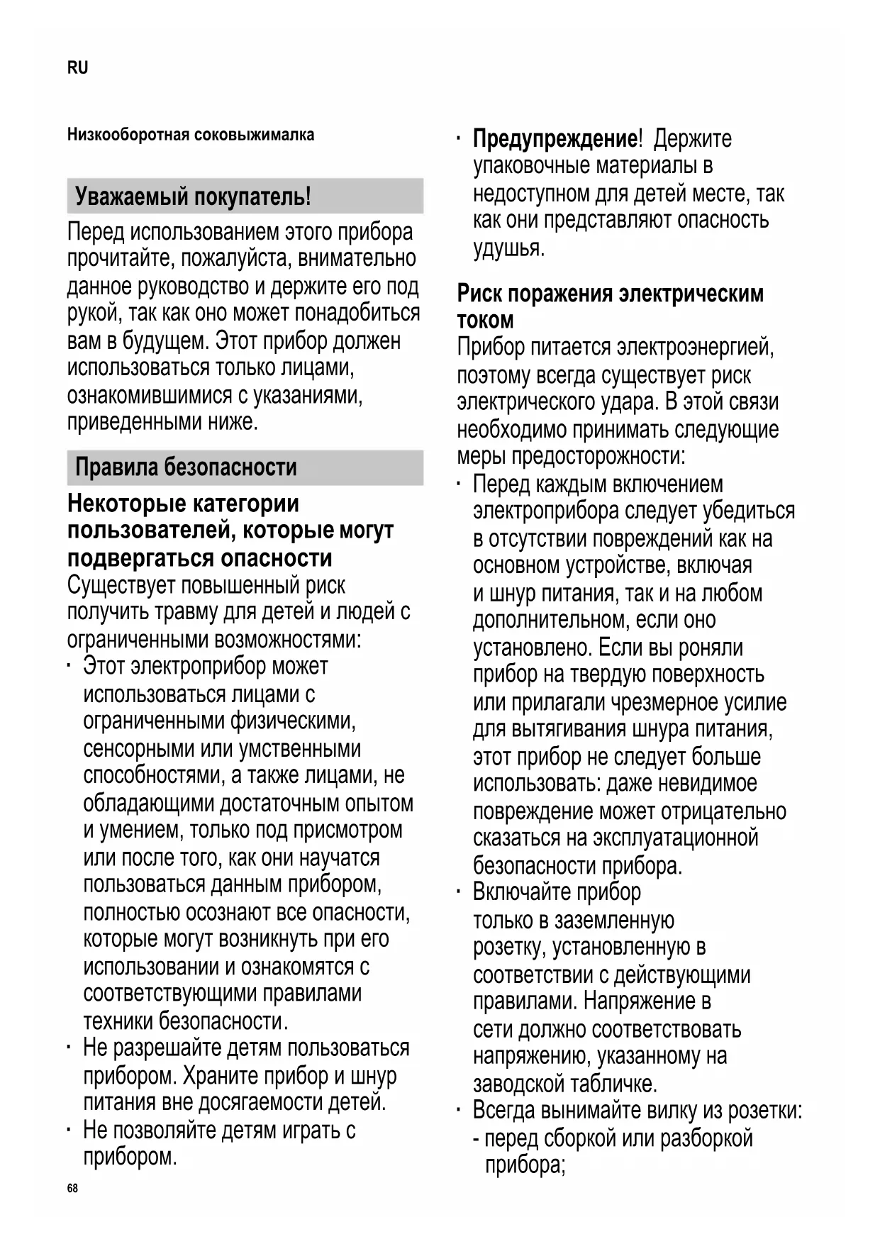 Низкооборотная соковыжималка Уважаемый покупатель! Перед использованием этого прибора прочитайте, пожалуйста, внимательно данное руководство и держите его под рукой, так как оно может понадобиться вам в будущем. Этот прибор должен использоваться только лицами, ознакомившимися с указаниями, приведенными ниже. Правила безопасности Некоторые категории пользователей, которые