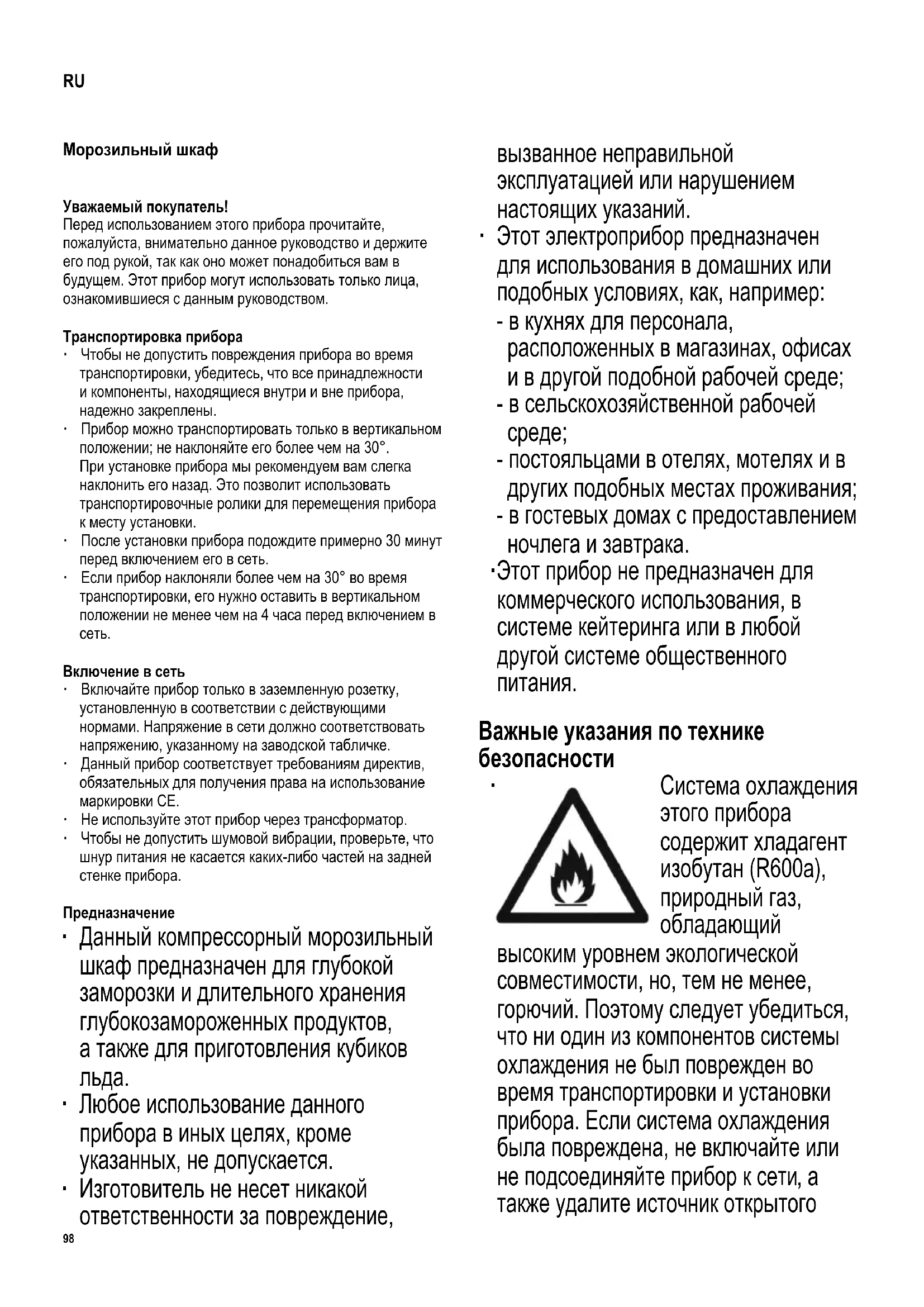 также удалите источник открытого RU99 пламени или любой другой источник возгорания, находящийся вблизи хладагента, после чего тщательно проветрите комнату, в которой находится прибор. ∙ Предупреждение. Не загромождайте вентиляционные отверстия, находящиеся на корпусе прибора или внутри него. В комнате должна быть постоянно обеспечена достаточная вентиляция. ∙ Предупреждение. Не допускайте повреждения системы охлаждения. Выходящий из системы хладагент может повредить глаза; возможно также возгорание хладагента. ∙ Предупреждение. Не пользуйтесь никакими посторонними приспособлениями (например, нагревателями или тепловентиляторами для ускорения размораживания прибора; используйте только те способы, которые рекомендованы в настоящем руководстве). ∙ Предупреждение. Не используйте внутри прибора электрические приборы (например, ледогенераторы), если это специально не оговорено в настоящем руководстве. ∙ Перед включением прибора в сеть, его необходимо тщательно проверить на наличие возможного повреждения при транспортировке, включая и шнур питания. Не используйте прибор при обнаружении повреждения. Не включайте его в сеть при обнаружении повреждения. ∙ Данный прибор не предназначен для хранения таких взрывоопасных веществ как, например, аэрозольные упаковки с горючими пропеллентами. ∙ При продаже или передаче данного прибора третьей стороне или при его передаче в соответствующую организацию для переработки и утилизации необходимо обратить внимание на наличие в нем изолирующего агента - циклопентана, а также хладагента R600a. Чтобы получить дополнительную информацию о правильной утилизации прибора, обратитесь, пожалуйста, к разделу Утилизация. ∙ В соответствии с требованиями правил техники безопасности и для исключения возможного травматизма любой ремонт этого устройства или внесение изменений в его конструкцию, включая и замену шнура питания, должен производиться нашим авторизованным сервисным персоналом. ∙ Этот прибор может использоваться детьми (не младше 8-летнего возраста) и лицами с ограниченными физическими, сенсорными или умственными способностями или