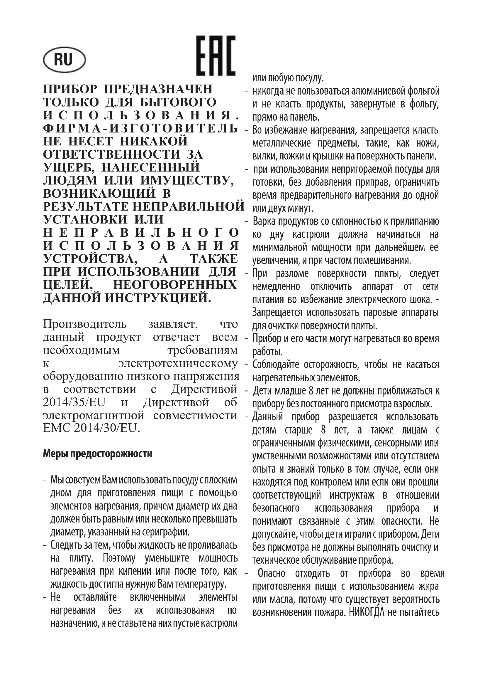 - Соблюдайте осторожность, чтобы не касаться нагревательных элементов. - Дети младше 8 лет не должны приближаться к прибору без постоянного присмотра взрослых. - Данный прибор разрешается использовать детям старше 8 лет, а также лицам с ограниченными физическими, сенсорными или умственными возможностями или отсутствием опыта и знаний только в том случае, если они находятся под контролем или если они прошли соответствующий инструктаж в отношении безопасного использования прибора и понимают связанные с этим опасности. Не допускайте, чтобы дети играли с прибором. Дети без присмотра не должны выполнять очистку и техническое обслуживание прибора. - Опасно отходить от прибора во время приготовления пищи с использованием жира или масла, потому что существует вероятность возникновения пожара. НИКОГДА не пытайтесь RUпотушить огонь водой. В таком случае следует отключить прибор от источника питания, а затем накрыть пламя, например, крышкой или покрывалом. - Процес готовки должен быть контролируем. Процес быстрого приготовления должен проходить всегда под наблюдением. - Готовка с жиром или маслом может быть опасна и провоцировать пожар. - Опасность возникновения пожара: не оставляйте предметы на варочных поверхностях. - Используйте только такие средства защиты столешницы, которые разработаны производителем прибора для приготовления или указаны производителем в инструкциях по применению, либо средства защиты столешницы, которые входят в комплект поставки прибора. Использование неподходящих средств защиты может привести к возникновению несчастных случаев. Выполните подключение к стационарной проводке с учетом того, что отключение от питающей сети должно осуществляться с зазорами между всеми контактами, обеспечивающими полный разрыв цепи при перенапряжении, в соответствии с требованиями категории III и правилами прокладки. Розетка или многополюсный переключатель должны быть просты и доступны для подключения установленного аппарата. Данный прибор не предназначен для использования с внешним таймером или системой дистанционного управления. Конструктор снимает с себя всю ответственность в том случае, если все вышеуказанные требования и обычные нормы предосторожности не будут