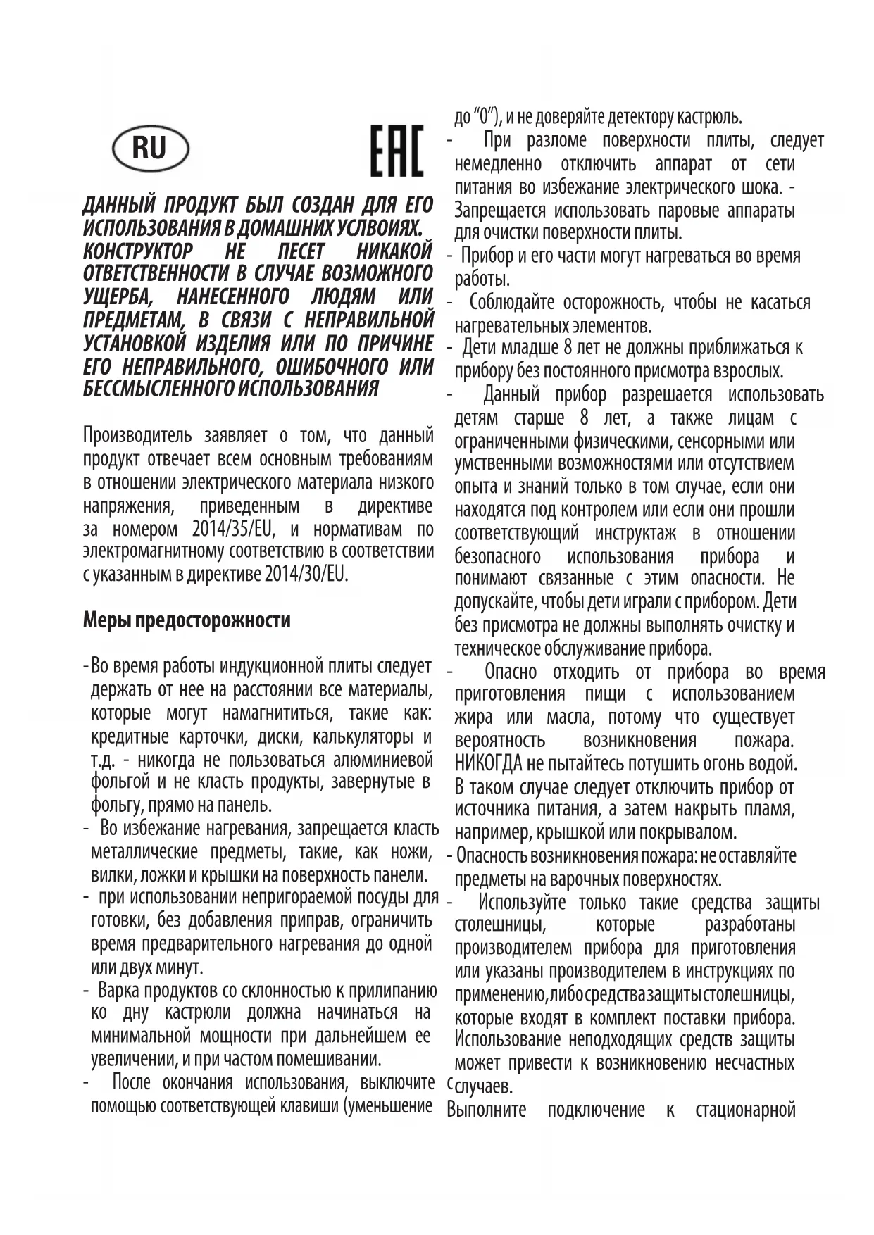Во время работы индукционной плиты следует держать от нее на расстоянии все материалы, которые могут намагнититься, такие как: кредитные карточки, диски, калькуляторы и т.д. - никогда не пользоваться алюминиевой фольгой и не класть продукты, завернутые в фольгу, прямо на панель. - Во избежание нагревания, запрещается класть металлические предметы, такие, как ножи, вилки, ложки и крышки на поверхность панели. - при использовании непригораемой посуды для готовки, без добавления приправ, ограничить время предварительного нагревания до одной или двух минут. - Варка продуктов со склонностью к прилипанию ко дну кастрюли должна начинаться на минимальной мощности при дальнейшем ее увеличении, и при частом помешивании. - После окончания использования, выключите с помощью соответствующей клавиши (уменьшение до “0”), и не доверяйте детектору кастрюль. - При разломе поверхности плиты, следует немедленно отключить аппарат от сети питания во избежание электрического шока. - Запрещается использовать паровые аппараты для очистки поверхности плиты. - Прибор и его части могут нагреваться во время