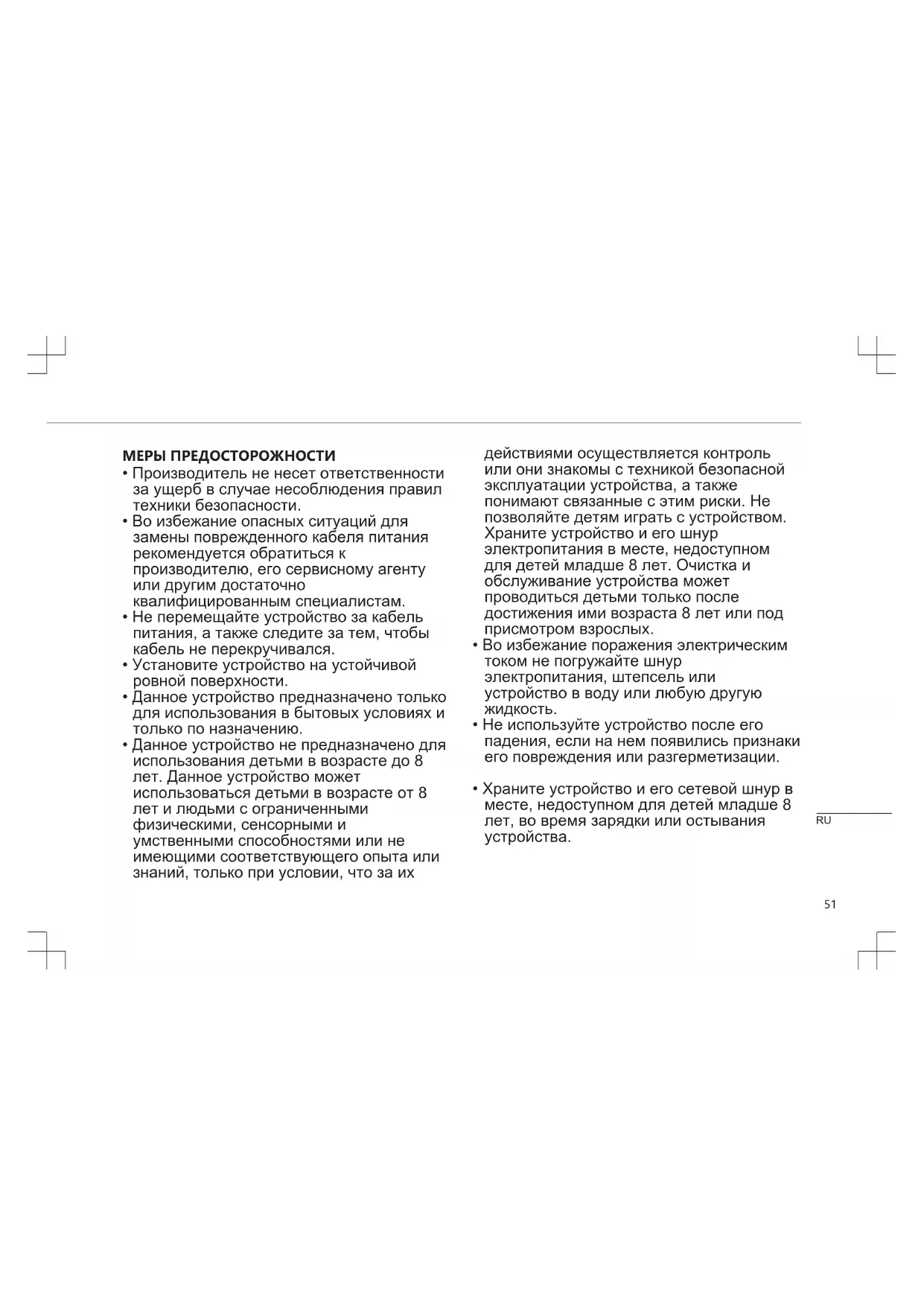 - Храните устройство и его сетевой шнур в месте, недоступном для детей младше 8 лет, во время зарядки или остывания устройства. RU52