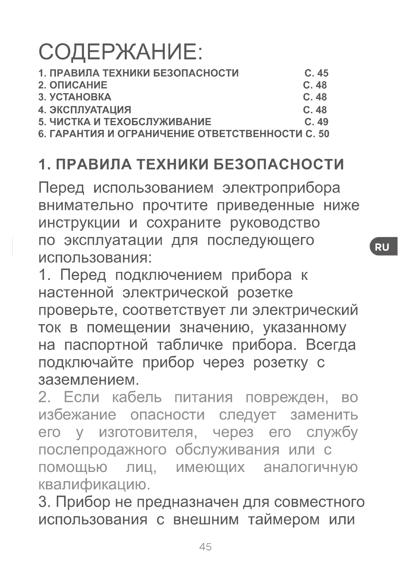 RO1. ПРАВИЛА ТЕХНИКИ БЕЗОПАСНОСТИ Перед использованием электроприбора внимательно прочтите приведенные ниже инструкции и сохраните руководство по эксплуатации для последующего использования:
