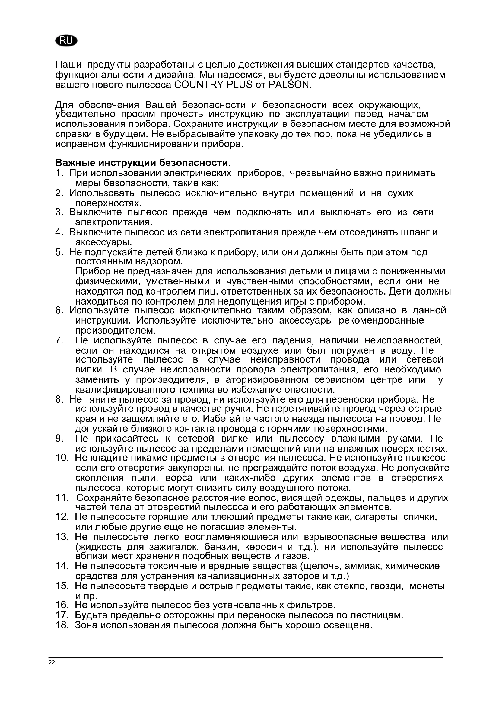 Country Plus - Пылесос PALSON - Бесплатное руководство пользователя