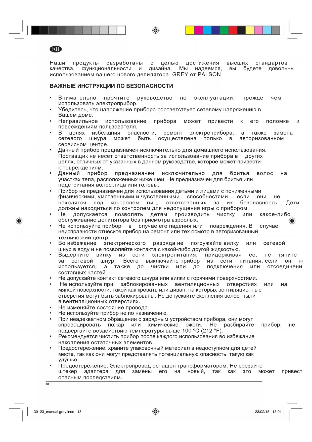 Скачайте инструкцию для вашего бритва в формате PDF бесплатно! Найдите своё руководство Grey - PALSON и возьмите своё электронное устройство обратно в руки. На этой странице опубликованы все документы, необходимые для использования вашего устройства. Grey бренда PALSON.