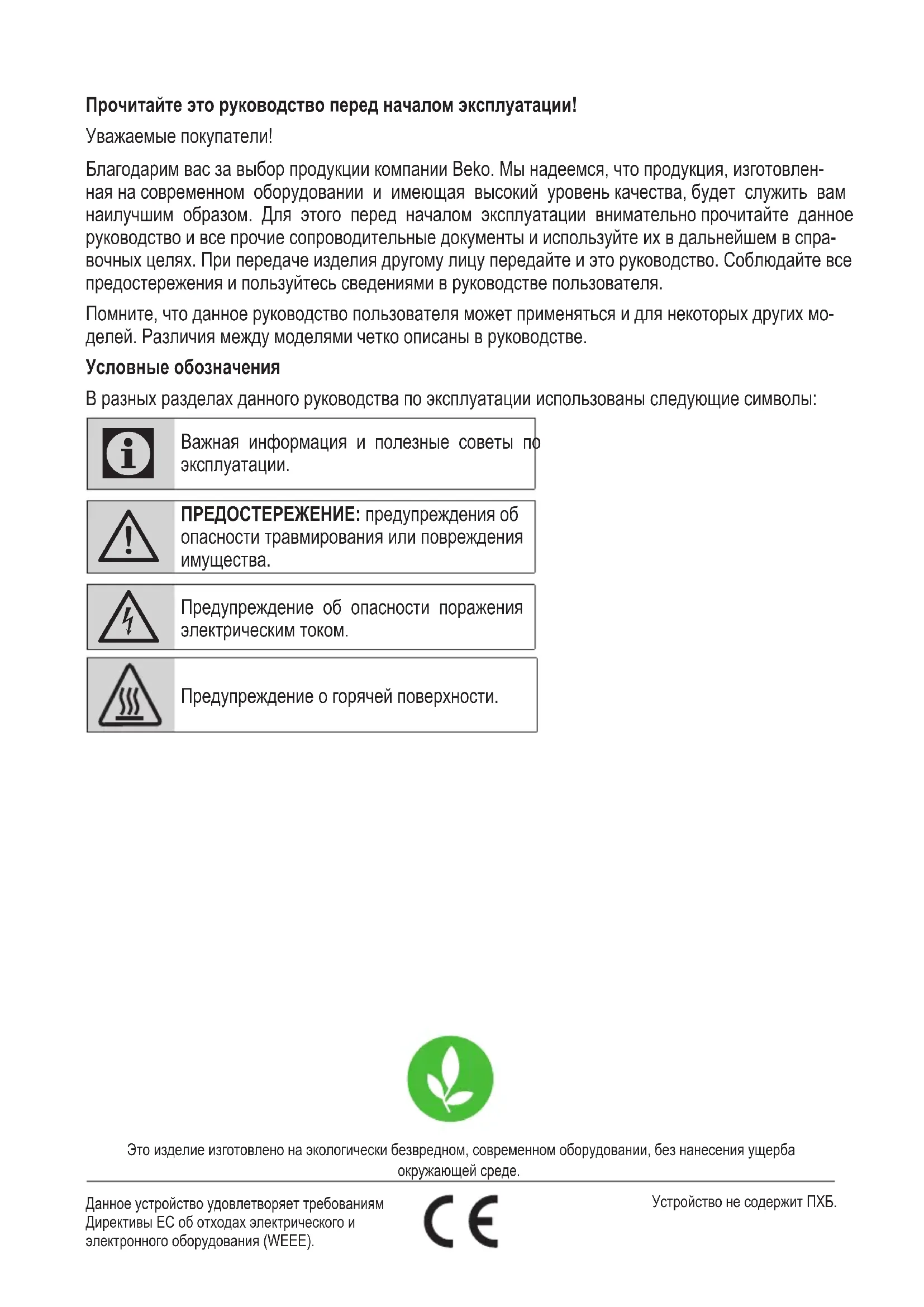 AVISO: Antes de tocar nas lâmpa-das, certifique-se de que já arrefe-ceram. Contacte o Agente de Serviço Autorizado para substituição da lâmpada.Это изделие изготовлено на экологически безвредном, современном оборудовании, без нанесения ущерба окружающей среде. Данное устройство удовлетворяет требованиям Директивы ЕС об отходах электрического и электронного оборудования (WEEE). Устройство не содержит ПХБ. Прочитайте это руководство перед началом эксплуатации! Уважаемые покупатели! Благодарим вас за выбор продукции компании Beko. Мы надеемся, что продукция, изготовлен- ная на современном оборудовании и имеющая высокий уровень качества, будет служить вам наилучшим образом. Для этого перед началом эксплуатации внимательно прочитайте данное руководство и все прочие сопроводительные документы и используйте их в дальнейшем в спра- вочных целях. При передаче изделия другому лицу передайте и это руководство. Соблюдайте все предостережения и пользуйтесь сведениями в руководстве пользователя. Помните, что данное руководство пользователя может применяться и для некоторых других мо- делей. Различия между моделями четко описаны в руководстве. Условные обозначения В разных разделах данного руководства по эксплуатации использованы следующие символы: