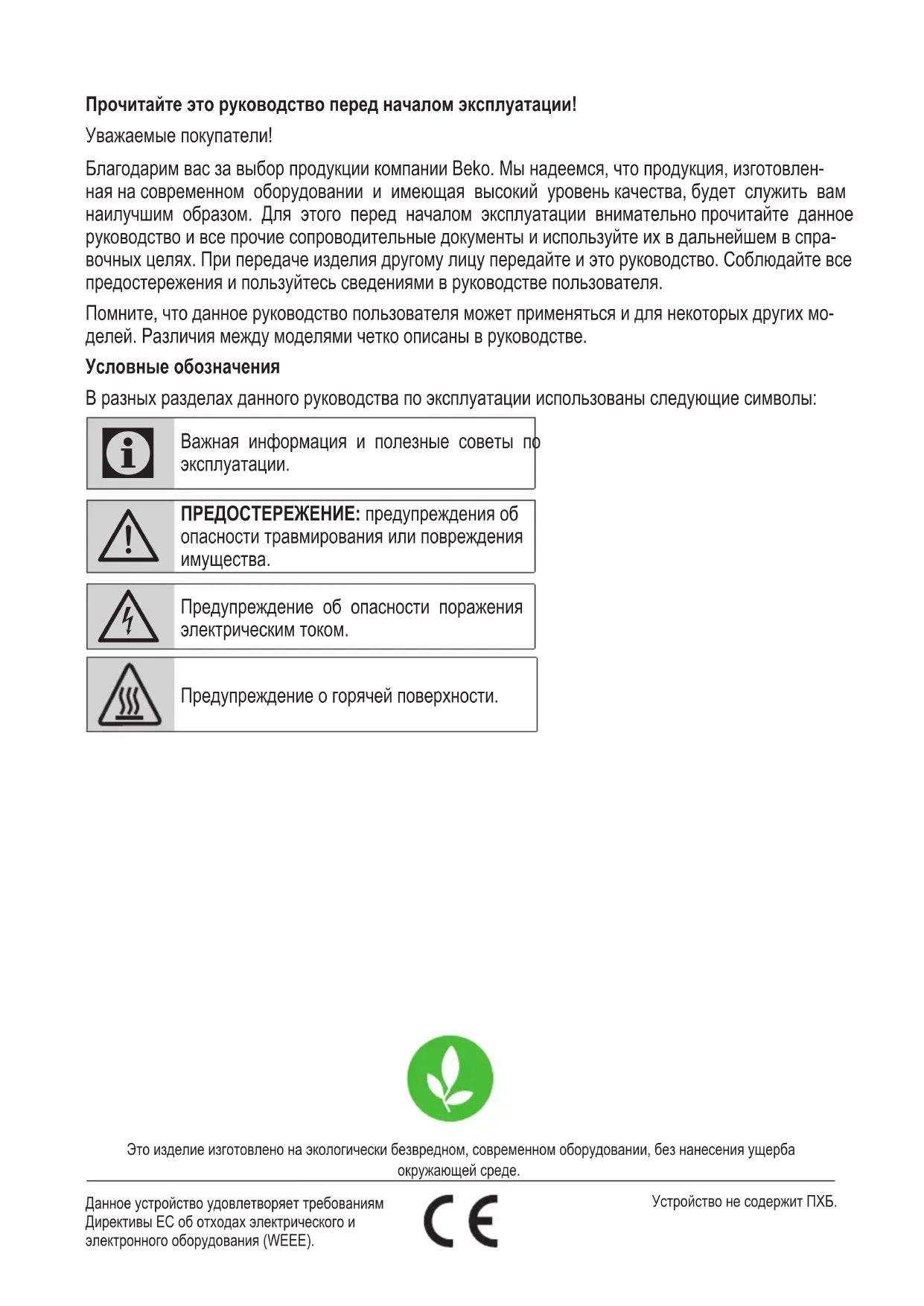 AVISO: Antes de tocar nas lâmpa-das, certifique-se de que já arrefe-ceram. Contacte o Agente de Serviço Autorizado para substituição da lâmpada.Это изделие изготовлено на экологически безвредном, современном оборудовании, без нанесения ущерба окружающей среде. Данное устройство удовлетворяет требованиям Директивы ЕС об отходах электрического и электронного оборудования (WEEE). Устройство не содержит ПХБ. Прочитайте это руководство перед началом эксплуатации! Уважаемые покупатели! Благодарим вас за выбор продукции компании Beko. Мы надеемся, что продукция, изготовлен- ная на современном оборудовании и имеющая высокий уровень качества, будет служить вам наилучшим образом. Для этого перед началом эксплуатации внимательно прочитайте данное руководство и все прочие сопроводительные документы и используйте их в дальнейшем в спра- вочных целях. При передаче изделия другому лицу передайте и это руководство. Соблюдайте все предостережения и пользуйтесь сведениями в руководстве пользователя. Помните, что данное руководство пользователя может применяться и для некоторых других мо- делей. Различия между моделями четко описаны в руководстве. Условные обозначения В разных разделах данного руководства по эксплуатации использованы следующие символы: