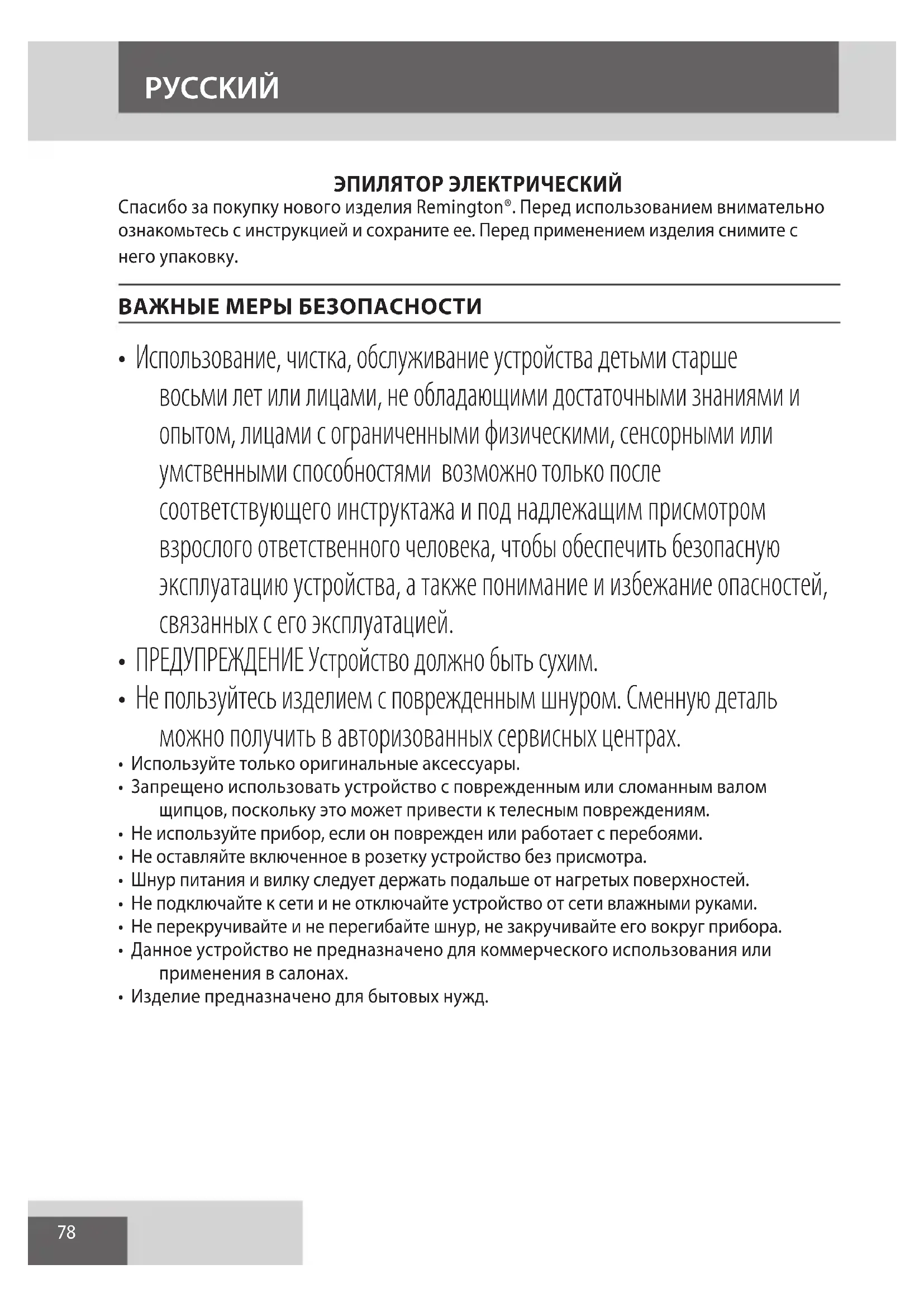 - По гигиеническим соображениям не позволяйте другим людям пользоваться Вашим эпилятором. Он предназначен для индивидуального использования. ЧИСТКА И ОБСЛУЖИВАНИЕ Для обеспечения длительной и безупречной эксплуатации эпилятора регулярно очищайте его головку. ОЧИСТИТЕ ГОЛОВКУ ЭПИЛЯТOРА ПОСЛЕ КАЖДОГО ПРИМЕНЕНИЯ