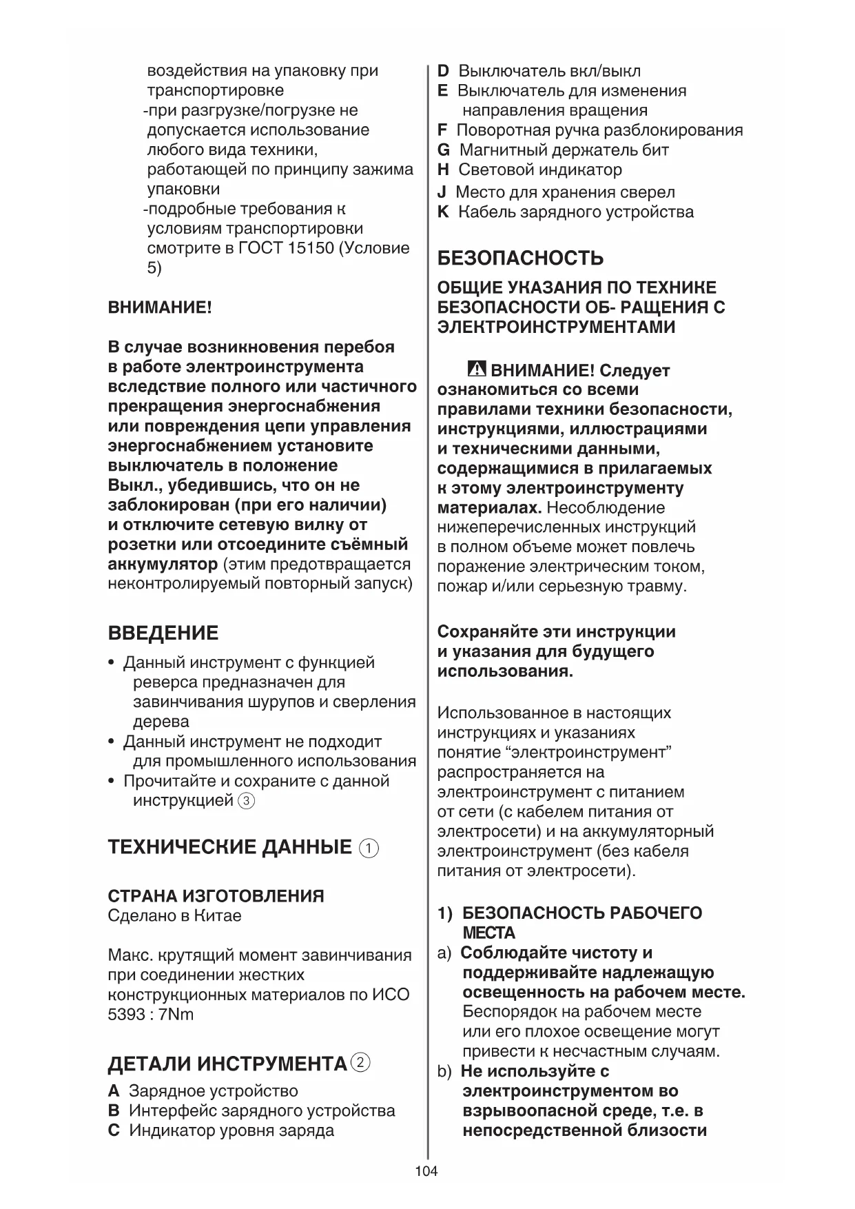 В состав эксплуатационных документов, предусмотренных изготовителем для продукции, могут входить настоящее руководство по эксплуатации, а также приложения. Информация о подтверждении соответствия содержится в приложении.104 D Выключатель вкл/выкл E Выключатель для изменения напpавления вpащения F Поворотная ручка разблокирования G Магнитный держатель бит H Световой индикатор J Место для хранения сверел K Кабель зарядного устройства БЕЗОПАСНОСТЬ ОБЩИЕ УКАЗАНИЯ ПО ТЕХНИКЕ БЕЗОПАСНОСТИ ОБ- РАЩЕНИЯ С ЭЛЕКТРОИНСТРУМЕНТАМИ - ВНИМАНИЕ! Следует ознакомиться со всеми правилами техники безопасности, инструкциями, иллюстрациями и техническими данными, содержащимися в прилагаемых к этому электроинструменту материалах. Несоблюдение нижеперечисленных инструкций в полном объеме может повлечь поражение электрическим током, пожар и/или серьезную травму. Сохраняйте эти инструкции и указания для будущего использования. Использованное в настоящих инструкциях и указаниях понятие “электроинструмент” распространяется на электроинструмент с питанием от сети (с кабелем питания от электросети) и на аккумуляторный электроинструмент (без кабеля питания от электросети).
