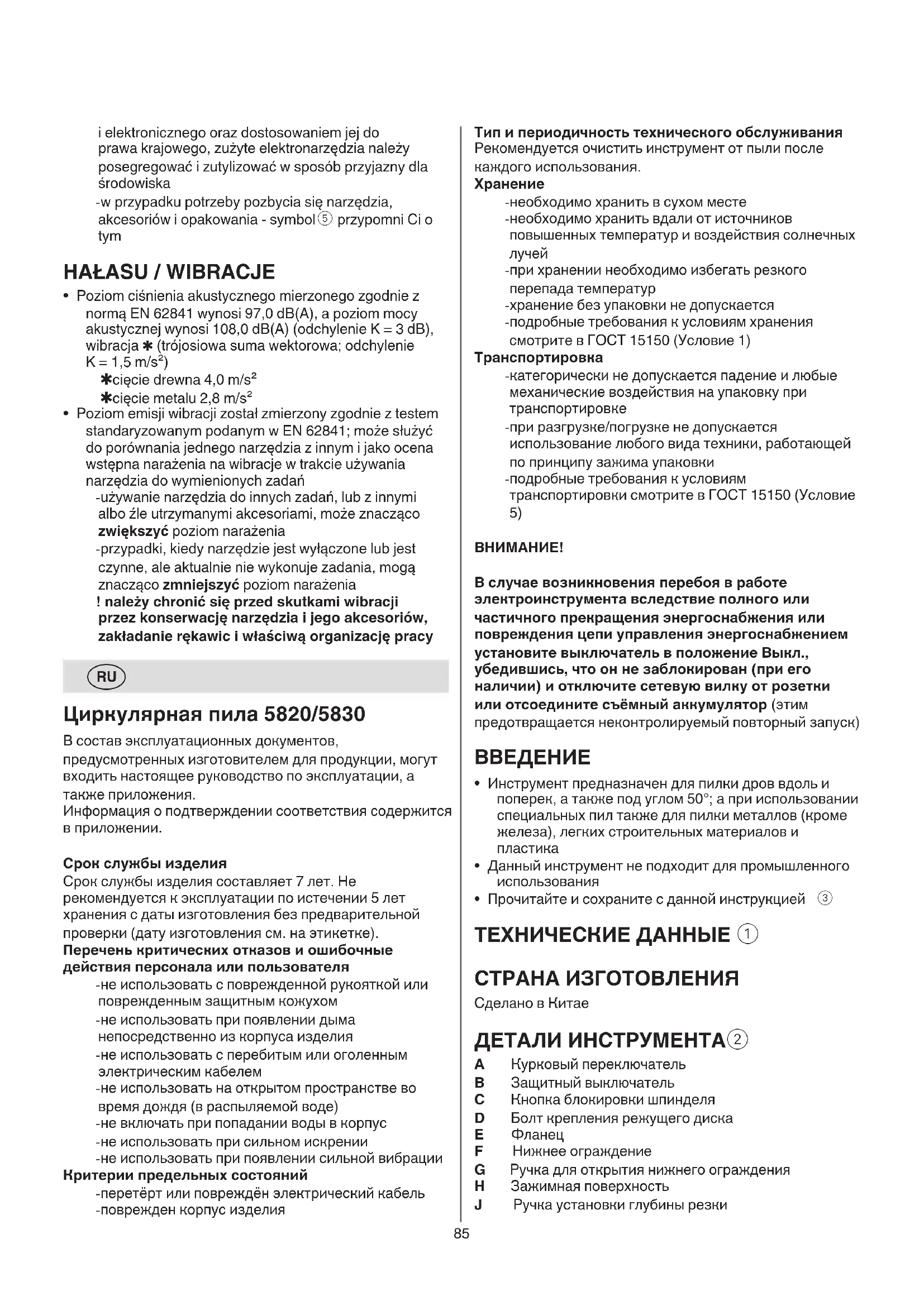 Циркулярная пила 5820/5830 В состав эксплуатационных документов, предусмотренных изготовителем для продукции, могут входить настоящее руководство по эксплуатации, а также приложения. Информация о подтверждении соответствия содержится в приложении. Срок службы изделия Срок службы изделия составляет 7 лет. Не рекомендуется к эксплуатации по истечении 5 лет хранения с даты изготовления без предварительной проверки (дату изготовления см. на этикетке). Перечень критических отказов и ошибочные действия персонала или пользователя - не использовать с поврежденной рукояткой или поврежденным защитным кожухом - не использовать при появлении дыма непосредственно из корпуса изделия - не использовать с перебитым или оголенным электрическим кабелем - не использовать на открытом пространстве во время дождя (в распыляемой воде) - не включать при попадании воды в корпус - не использовать при сильном искрении - не использовать при появлении сильной вибрации Критерии предельных состояний - перетёрт или повреждён электрический кабель - поврежден корпус изделия86 соответствующие им сетевые розетки существенно снижают вероятность электрошока. b) Избегайте механических контактов с такими заземленными поверхностями, как трубопроводы, системы отопления, плиты и холодильники. При соприкосновении человека с заземленными предметами во время работы инструментом вероятность электрошока существенно возрастает. c) Оберегайте электроинструмент от воздействия дождя и влаги. Попадание воды в электроинструмент повышает вероятность электрического удара. d) Используйте кабель строго по назначению. Не допускается тянуть и передвигать электроинструмент за кабель или использовать кабель для вытягивания вилки из розетки. Оберегайте кабель инструмента от воздействия высоких температур, масла, острых кромок или движущихся частей электроинструмента. Поврежденный или спутанный кабель повышает возможность электрического удара. e) При работе на улице используйте удлинитель, предназначенный для работы вне помещения. Использование такого удлинителя снижает вероятность электрического удара. f) Если невозможно избежать применения электроинструмента в сыром помещении, то устанавливайте устройство защиты от утечки в землю. Использование устройства защиты от утечки в землю снижает риск электрического поражения.
