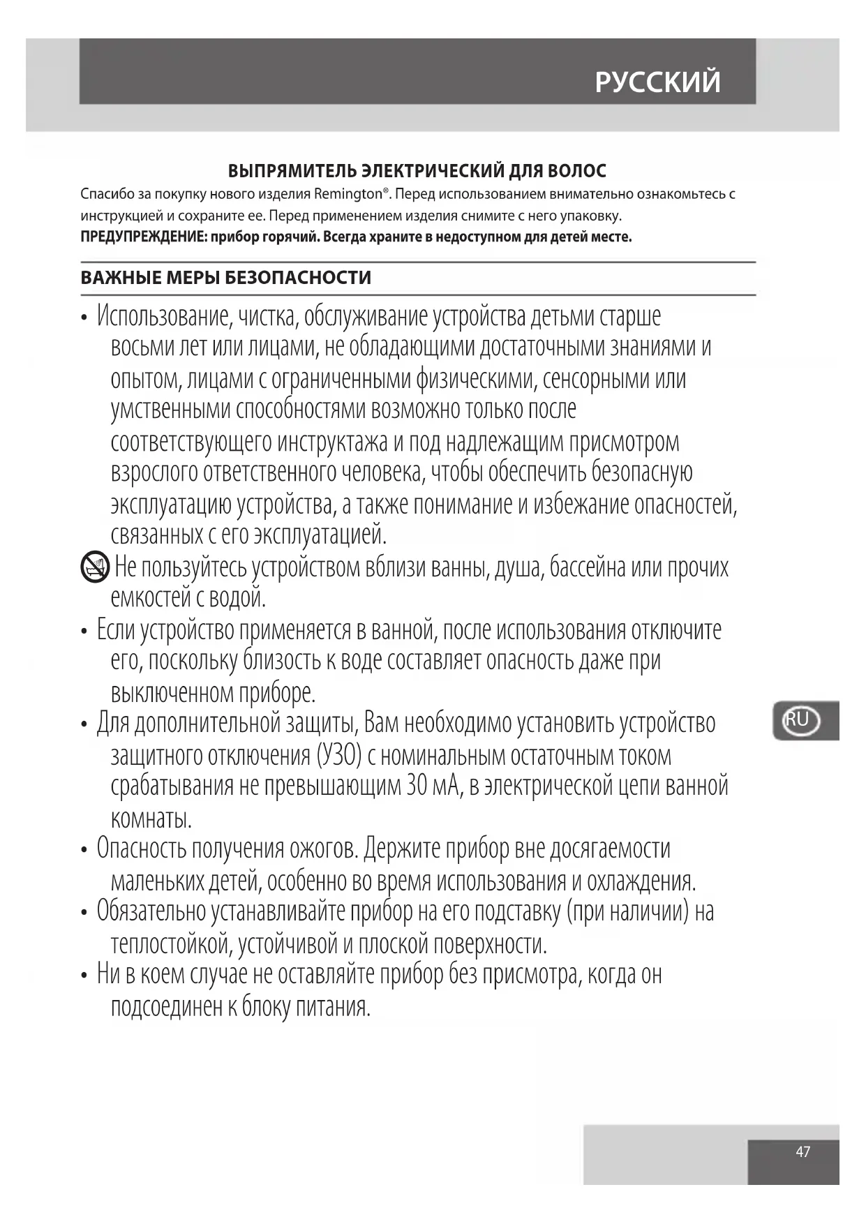- При повреждении шнура следует немедленно прекратить использование устройства и вернуть устройство в ближайший авторизованный сервисный центр Remington® для ремонта или замены, чтобы избежать опасности.
