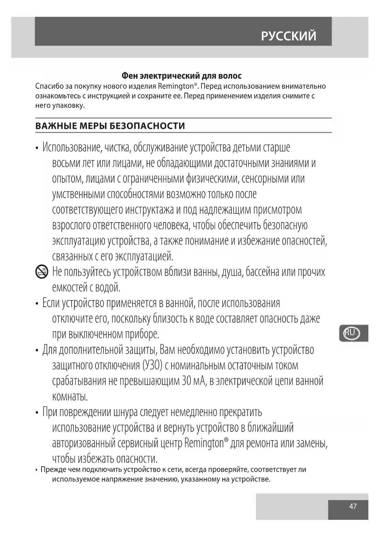 - При повреждении шнура следует немедленно прекратить использование устройства и вернуть устройство в ближайший авторизованный сервисный центр Remington® для ремонта или замены, чтобы избежать опасности.