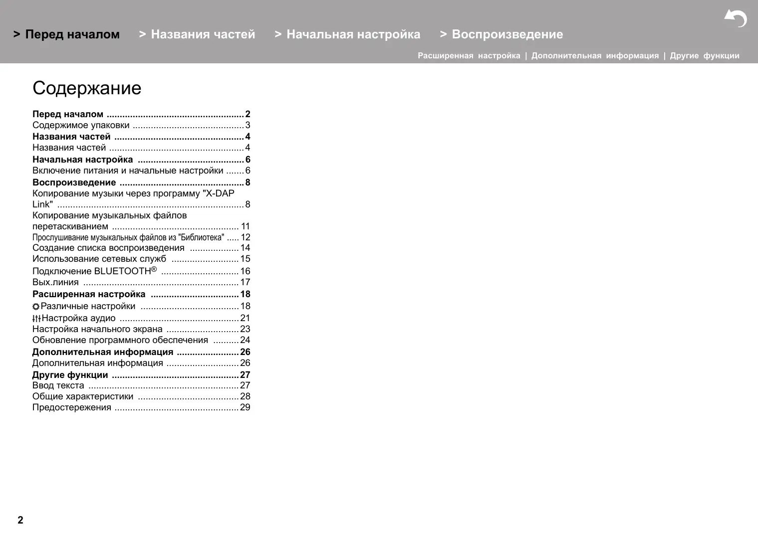 > Перед началом > Названия частей > Начальная настройка > Воспроизведение Расширенная настройка | Дополнительная информация | Другие функции Ввод текста Äðóãèå ôóíêöèè