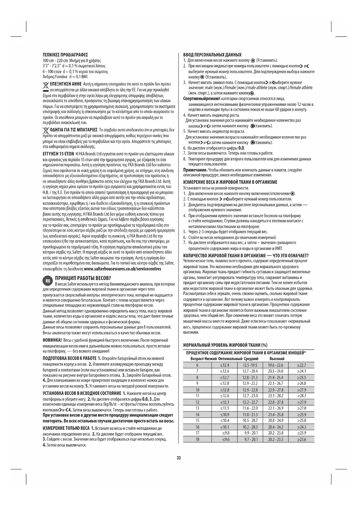 Мужчина/женщина d = 0,1 BMI ПОЯСНЕНИЕ WEEE Данная маркировка означает, что в странах Европы не допускается утилизировать прибор вместе с другими бытовыми отходами. Чтобы не нанести ущерба окружающей среде и здоровью населения в результате неверной утилизации отходов, прибор следует сдать на переработку, чтобы обеспечить экологичное повторное использование материальных ресурсов. Верните бывший в употреблении прибор через систему возврата и сбора отходов или свяжитесь с предприятием розничной торговли, где вы приобрели прибор. Там вы сможете сдать этот продукт для экологически безопасной переработки. ИНСТРУКЦИИ К БАТАРЕЯМ Данный символ означает, что батареи не следует утилизировать совместно с бытовым мусором, поскольку они содержат вещества, способные нанести вред окружающей среде и здоровью. Утилизируйте батареи в специально предназначенных для этого приемных пунктах. ГАРАНТИЯ: 15 ЛЕТ Компания ФКА Брендс, Лимитед (FKA Brands, Ltd) гарантирует отсутствие дефектов материалов и качество изготовления продукции на срок 15 лет со дня приобретения, за исключением примечаний ниже. Гарантийные обязательства не распространяются на повреждения, вызванные: неправильным использованием устройства или использованием с нарушением правил; несчастными случаями; подключением аксессуаров неодобренных изготовителем; изменениями, внесенными в изделие; а также всеми иными условиями, которые находятся вне сферы контроля компании FKA Brands, Ltd. Данная гарантия распространяется только на устройства реализованные и используемые на территории Великобритании / ЕС. Настоящая гарантия не распространяется на устройства, в которые были внесены изменения, которые бы позволили пользоваться ими в какой-либо другой стране кроме страны, для которой оно было: изготовлено, произведено, апробировано и/или авторизовано, а также на ремонт поломок изделий, вызванных такими изменениями, повреждениями или модификациями. Компания FKA Brands, Ltd. не несет ответственности за случайные, косвенные или намеренные повреждения любых типов. Для того, чтобы получить гарантийное обслуживание, отправьте изделие в сервисный центр, оплатив почтовые расходы, вместе с чеком из магазина с проставленной датой продажи (как доказательство приобретения). После получения поврежденного изделия, компания FKA Brands, Ltd. обязуется отремонтировать или заменить его в зависимости от степени повреждений, после чего возвратит вам изделие, оплатив почтовые расходы. Гарантийное обслуживание должно проводится исключительно сервисным центром Salter. Обслуживание данного изделия, иными компаниями, кроме Salter, автоматически прекращает срок действия гарантии. Данная гарантия ни в какой мере не ущемляет Ваши законные права. Адрес и контактные данные ближайшего сервисного центра Salter, Вы можете получить перейдя по ссылке www.salterhousewares.co.uk/servicecentres