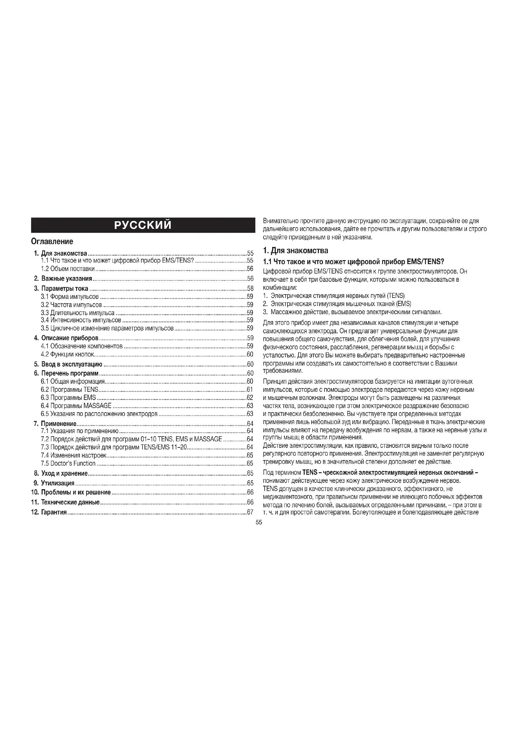 1.1 Что такое и что может цифровой прибор EMS/TENS? .................................55