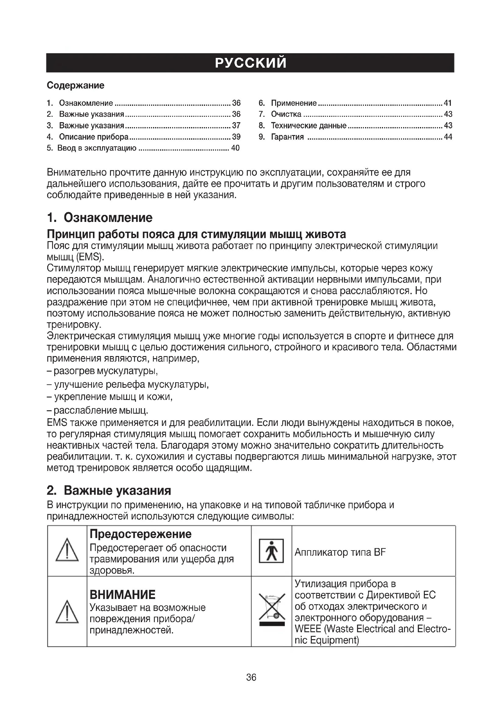 Использование по назначению – Используйте данный прибор только в целях, для которых он был разработан, и только способом, описанным в инструкции по эксплуатации. Любое неправильное использование может быть опасным. – Если у Вас в зоне применения имеются украшения или пирсинг (например, в пупке), то перед использованием прибора их необходимо снять, т. к. в противном случае можно получить точечные ожоги. – Не используйте этот прибор одновременно с другими приборами, которые передают телу электрические импульсы (например, TENS - приборы). – Прибор предназначен только для персонального пользования. Он не предназначен для использования в медицинских или коммерческих целях. – Изготовитель не несет ответственности за ущерб, вызванный неквалифицированным или неправильным использованием. – В случае сомнений не используйте его и обратитесь в торговую организацию, продавшую прибор, либо по указанному адресу службы технического обеспечения. – Используйте прибор только совместно с входящими в объем поставки принадлежностями. – макс. рекомендуемое выходное значение для электродов: 9 mA/cm2, эффективная плотность тока свыше 2 мА/см2 требует повышенной внимательности). – Пока прибор включен, не дотрагивайтесь до электродов. – По гигиеническим причинам прибором может пользоваться только один человек. Указание: В редких случаях может возникать раздражение кожи в области электродов. Использование не по назначению – Прибор запрещается применять: – в области головы: здесь он может вызывать приступы судорог, – в области шеи / сонных артерий: здесь он может вызывать остановку сердца, – в области полости глотки и гортани: здесь он может вызывать судороги, которые ведут к удушению, – вблизи грудной клетки: здесь он может повышать опасность мерцания желудочков сердца и вызвать остановку сердца. – Во избежание возможных опасностей храните прибор в недоступном для детей месте.38 – Данный прибор не предназначен для использования детьми или взрослыми с огра- ниченными физическими, сенсорными (например, невосприимчивость к боли) или умственными способностями, а также с недостаточным опытом и/или недостаточными знаниями, кроме случая, когда они будут находиться под присмотром ответственного за их безопасность лица или получат от него инструкции по использованию прибора. – Предохраняйте прибор от действия источников тепла. – Не пользуйтесь прибором вблизи коротковолновых и микроволновых приборов (например, мобильных телефонов), т. к. они могут повлиять на работу прибора. – Не используйте пояс, если за последние 90 минут Вы принимали пищу. – Не пользуйтесь прибором во время приема ванны или душа. Не храните прибор в местах, откуда он может упасть в ванну или умывальник. – Ни в коем случае не погружайте прибор в воду или другие жидкости.