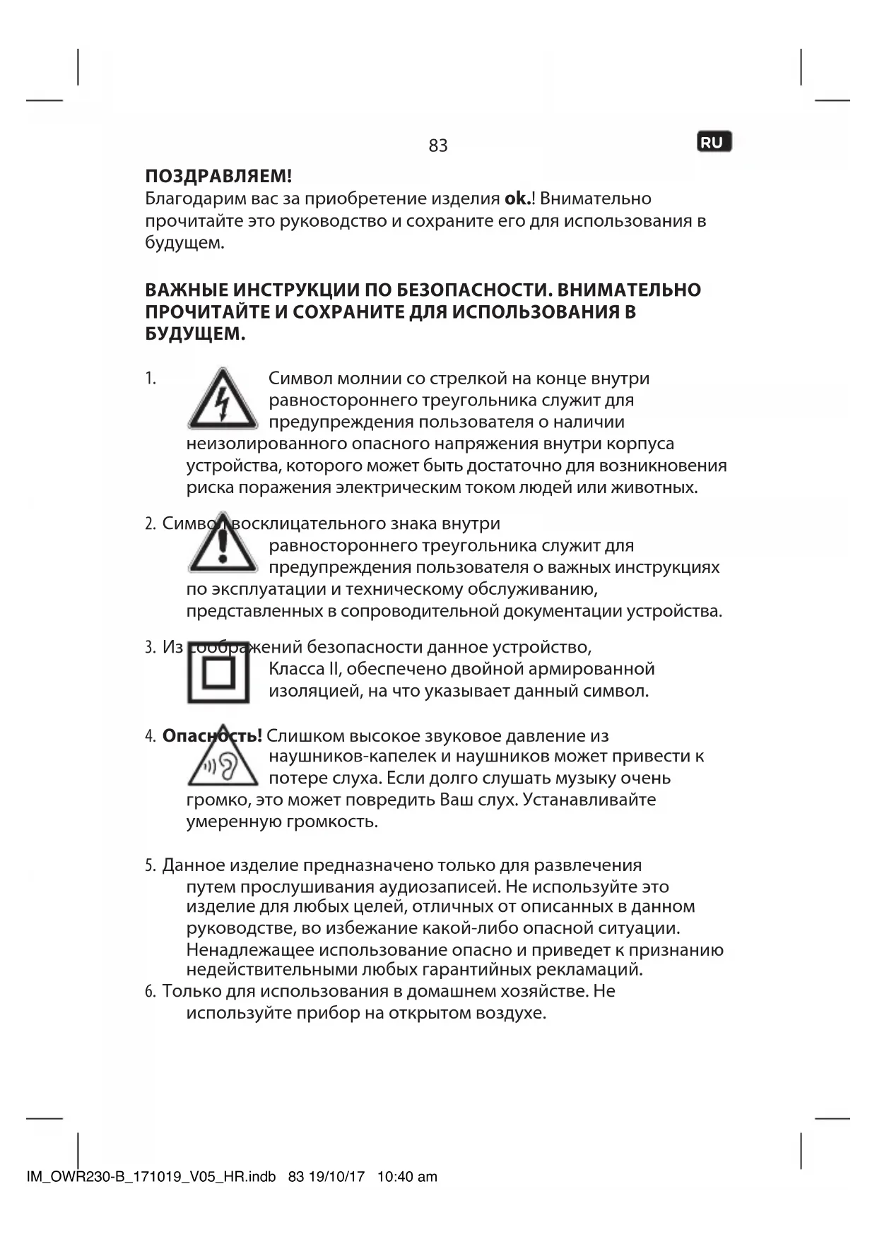 и избавьтесь от них надлежащим образом. Не допускайте контакта кислоты батареек с кожей или глазами. Если кислота батареек попала вам в глаза, тщательно промойте их большим количеством воды и немедленно проконсультируйтесь с врачом. Если кислота батареек попала вам на кожу, промойте задетые участки большим количеством воды и мылом. иСПОЛЬЗОВАниЕ ПО нАЗнАЧЕниЮ Данное изделие предназначено для воспроизведения музыки через FM/AM Radio, AUX IN или наушников. Любое иное использование может вызывать повреждение изделия или травмы. Это изделие предназначено только для домашнего использования и не подходит для коммерческого применения. Imtron GmbH не несет никакой ответственности за повреждение изделия, ущерб имуществу или травмы вследствие халатного отношения или использования изделия не по назначению, или использования изделия, не отвечающего определенным производителям целям. IM_OWR230-B_171019_V05_HR.indb 86 19/10/17 10:40 am87