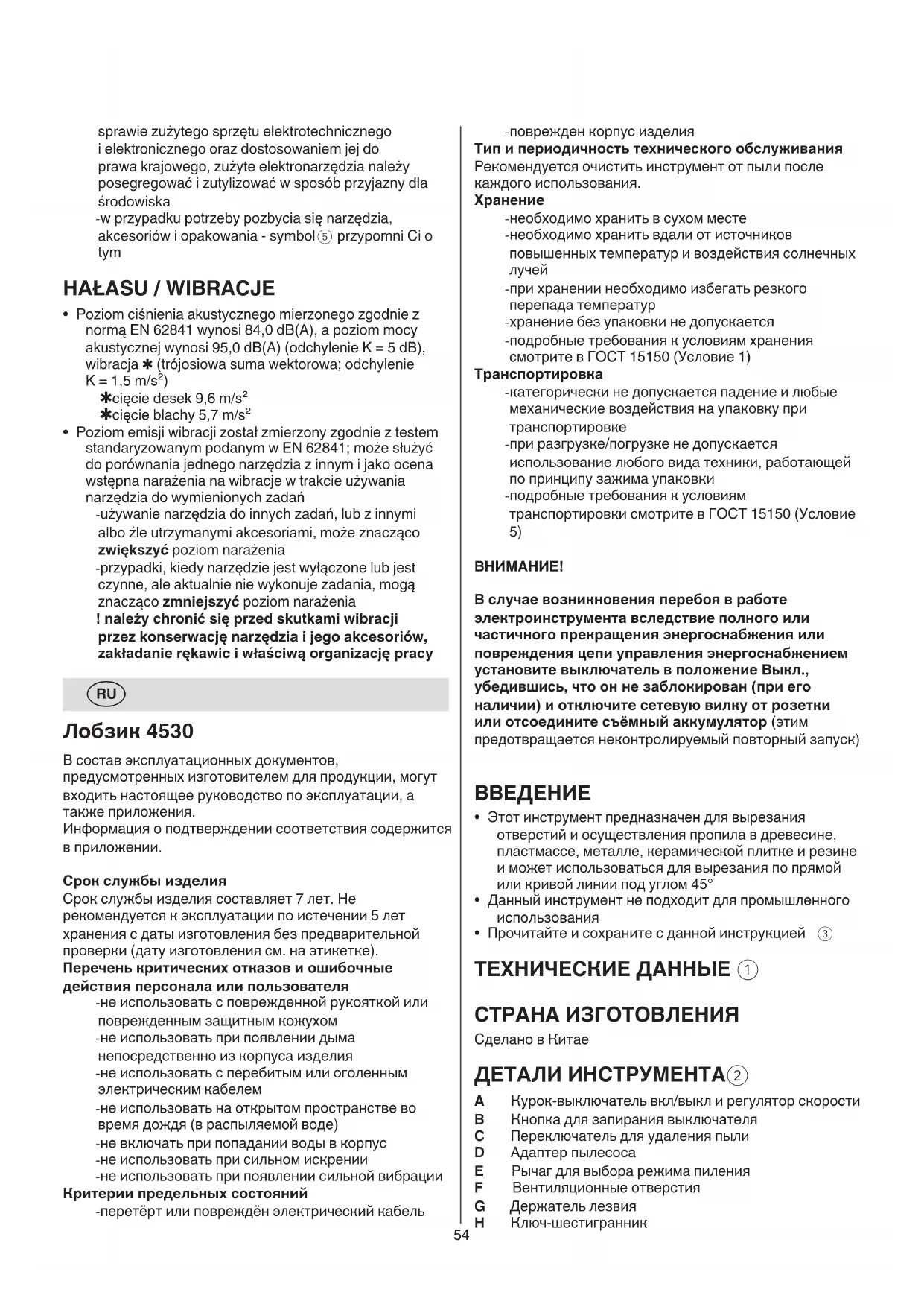 Лобзик 4530 В состав эксплуатационных документов, предусмотренных изготовителем для продукции, могут входить настоящее руководство по эксплуатации, а также приложения. Информация о подтверждении соответствия содержится в приложении. Срок службы изделия Срок службы изделия составляет 7 лет. Не рекомендуется к эксплуатации по истечении 5 лет хранения с даты изготовления без предварительной проверки (дату изготовления см. на этикетке). Перечень критических отказов и ошибочные действия персонала или пользователя - не использовать с поврежденной рукояткой или поврежденным защитным кожухом - не использовать при появлении дыма непосредственно из корпуса изделия - не использовать с перебитым или оголенным электрическим кабелем - не использовать на открытом пространстве во время дождя (в распыляемой воде) - не включать при попадании воды в корпус - не использовать при сильном искрении - не использовать при появлении сильной вибрации Критерии предельных состояний - перетёрт или повреждён электрический кабель55 кабель для вытягивания вилки из розетки. Оберегайте кабель инструмента от воздействия высоких температур, масла, острых кромок или движущихся частей электроинструмента. Поврежденный или спутанный кабель повышает возможность электрического удара. e) При работе на улице используйте удлинитель, предназначенный для работы вне помещения. Использование такого удлинителя снижает вероятность электрического удара. f) Если невозможно избежать применения электроинструмента в сыром помещении, то устанавливайте устройство защиты от утечки в землю. Использование устройства защиты от утечки в землю снижает риск электрического поражения.