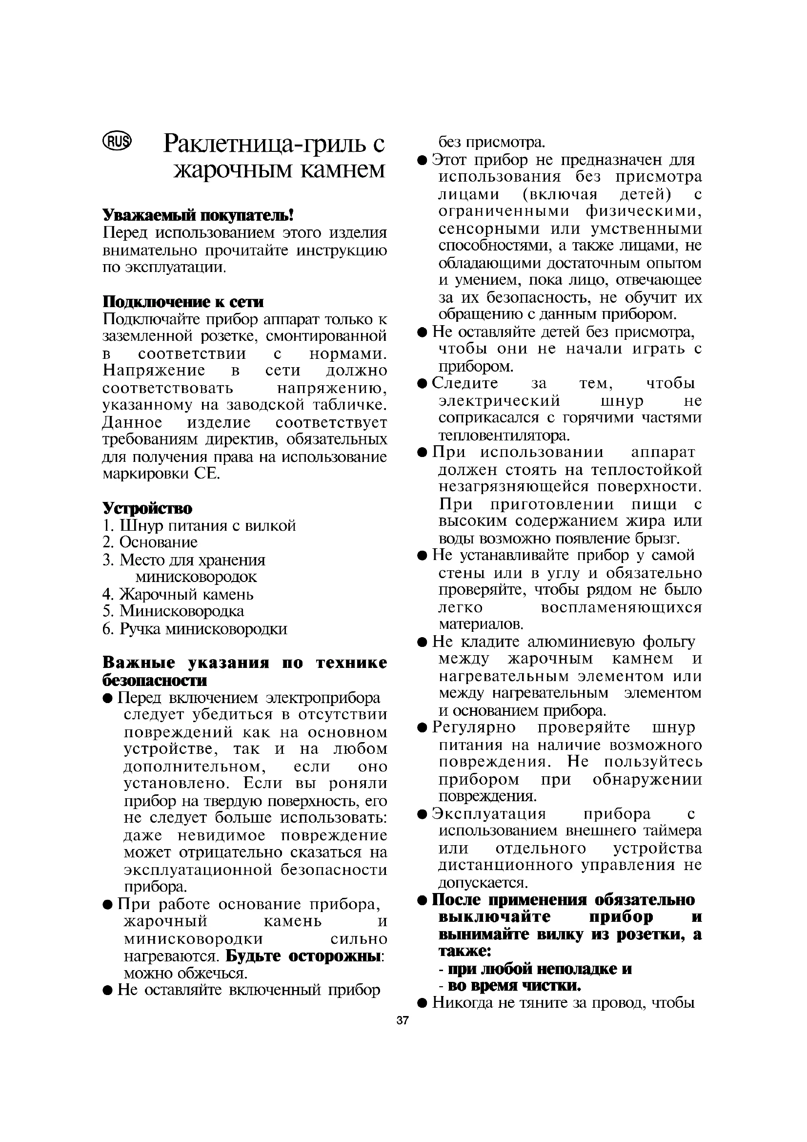 RUSвынуть вилку из настенной розетки, а только за саму вилку. ● Фирма не несёт ответственности за повреждения, произошедшие вследствие неправильного использования или несоблюдения данной инструкции. ● Это устройство предназначено исключительно для домашнего применения. ● В соответствии с требованиями правил техники безопасности и для исключения возможного травматизма ремонт электроприборов, включая и замену шнура питания, должен производиться квалифицированным персоналом. Если необходим ремонт, отправьте, пожалуйста, прибор в службу сервисного обслуживания, адрес которой указан в приложении к данной инструкции.